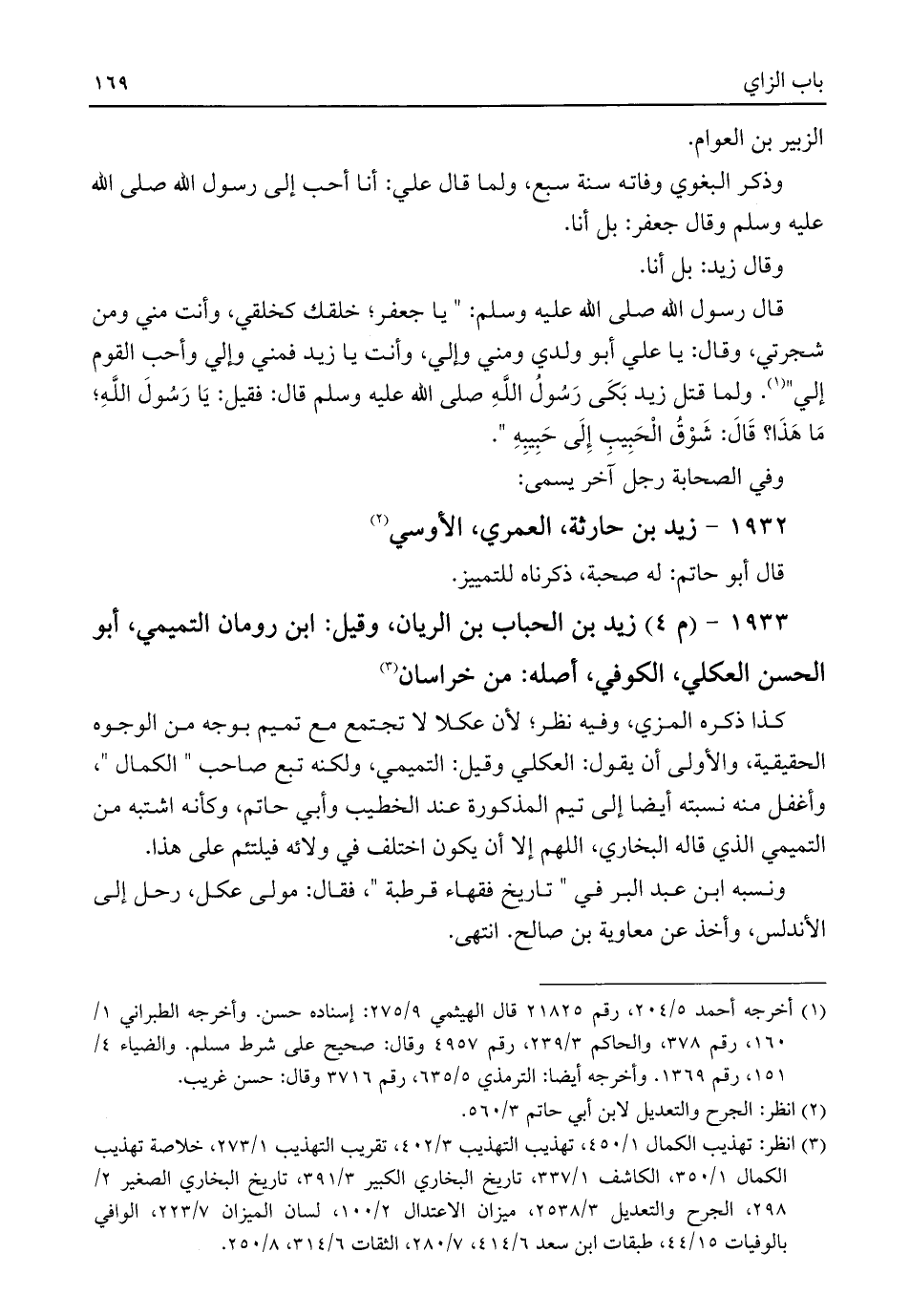 ١٩٣٣ - (م ٤) زيد بن الحباب بن الريان، وقيل: ابن رومان التميمي، أبو الحسن العكلي، الكوفي، أصله: من خراسان (¬٣)