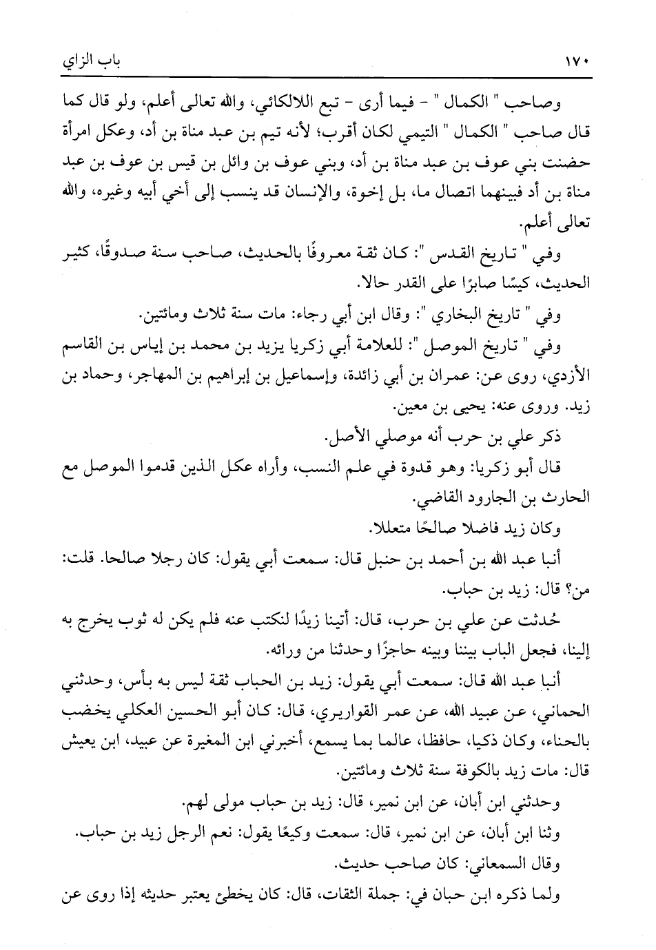 أنبا عبد اللَّه قال: سمعت أبي يقول: زيد بن الحباب ثقة ليس به بأس، وحدثني الحماني، عن عبيد اللَّه، عن عمر القواريري، قال: كان أبو الحسين العكلي يخضب بالحناء، وكان ذكيا، حافظا، عالما بما يسمع، أخبرني ابن المغيرة عن عبيد، ابن يعيش قال: مات زيد بالكوفة سنة ثلاث ومائتين.