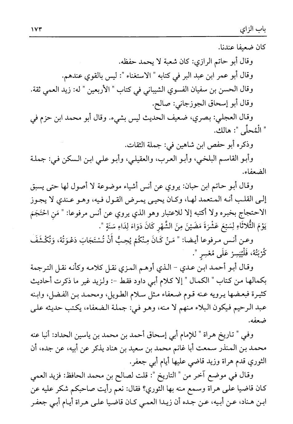 وقال أبو أحمد ابن عدي -الذي أوهم المزي نقل كلامه وكأنه نقل الترجمة بكمالها من كتاب "الكمال" إلا كلام أبي داود فقط-: ولزيد غير ما ذكرت أحاديث كثيرة فبعضها يرويه عنه قوم ضعفاء مثل سلام الطويل، ومحمد بن الفضل، وابنه عبد الرحيم فيكون البلاء منهم لا منه، وهو في: جملة الضعفاء، يكتب حديثه على ضعفه.