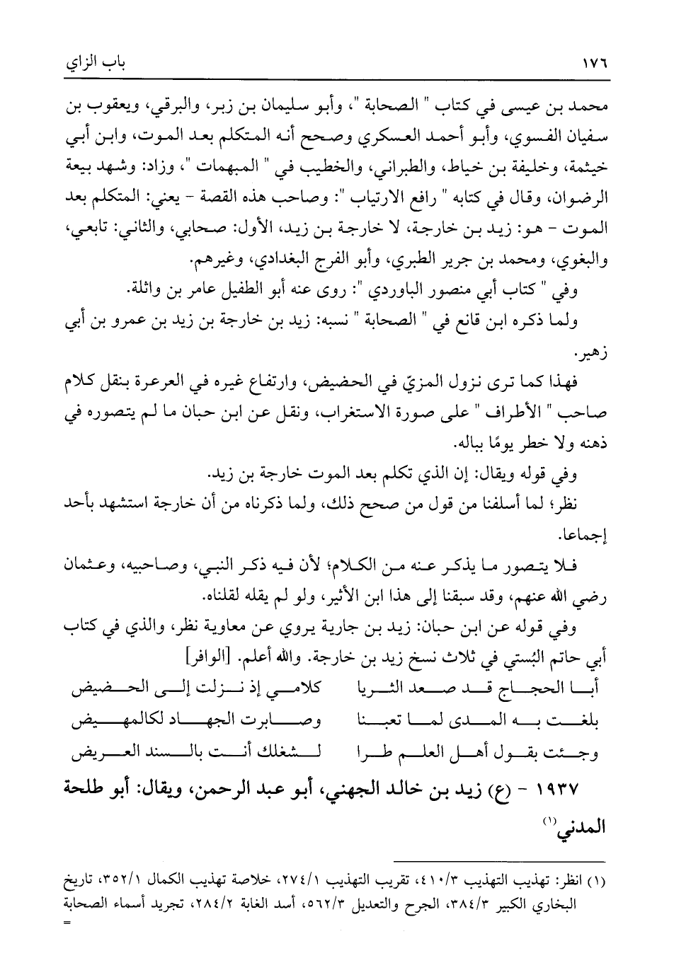 وفي قوله عن ابن حبان: زيد بن جارية يروي عن معاوية نظر، والذي في كتاب أبي حاتم البُستي في ثلاث نسخ زيد بن خارجة. واللَّه أعلم. [الوافر]