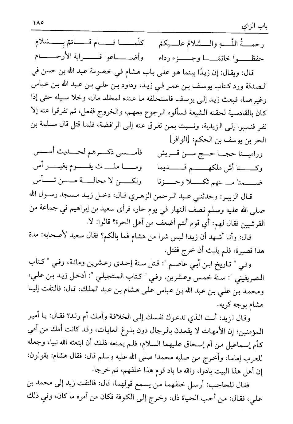 قال: ويقال: إن زيدًا بينما هو على باب هشام في خصومة عبد اللَّه بن حسن في الصدقة ورد كتاب يوسف بن عمر في زيد، وداود بن علي بن عبد اللَّه بن عباس وغيرهما، فبعث زيد إلى يوسف فاستحلفه ما عنده لمخلد مال، وخلا سبيله حتى إذا كان بالقادسية لحقته الشيعة فسألوه الرجوع معهم، والخروج ففعل، ثم تفرقوا عنه إلا نفر فنسبوا إلى الزيدية، ونسبت بمن تفرق عنه إلى الرافضة، فلما قتل قال مسلمة بن الحر بن يوسف بن الحكم: [الوافر]