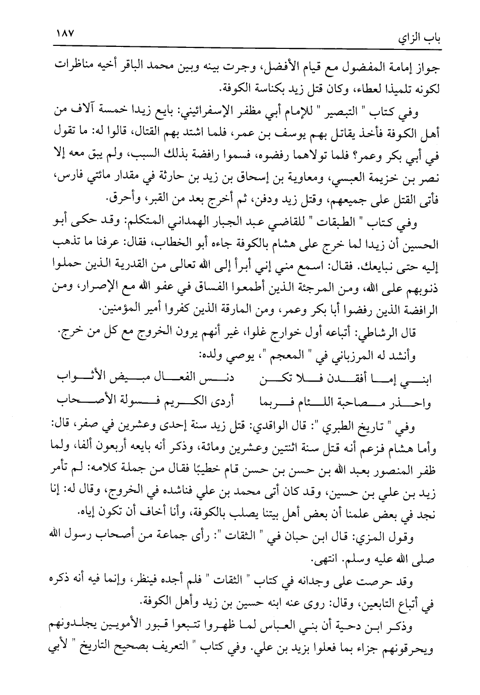 وفي "تاريخ الطبري": قال الواقدي: قتل زيد سنة إحدى وعشرين في صفر، قال: وأما هشام فزعم أنه قتل سنة اثنتين وعشرين ومائة، وذكر أنه بايعه أربعون ألفا، ولما ظفر المنصور بعبد اللَّه بن حسن بن حسن قام خطيبًا فقال من جملة كلامه: لم تأمر زيد بن علي بن حسين، وقد كان أتى محمد بن علي فناشده في الخروج، وقال له: إنا نجد في بعض علمنا أن بعض أهل بيتنا يصلب بالكوفة، وأنا أخاف أن تكون إياه.