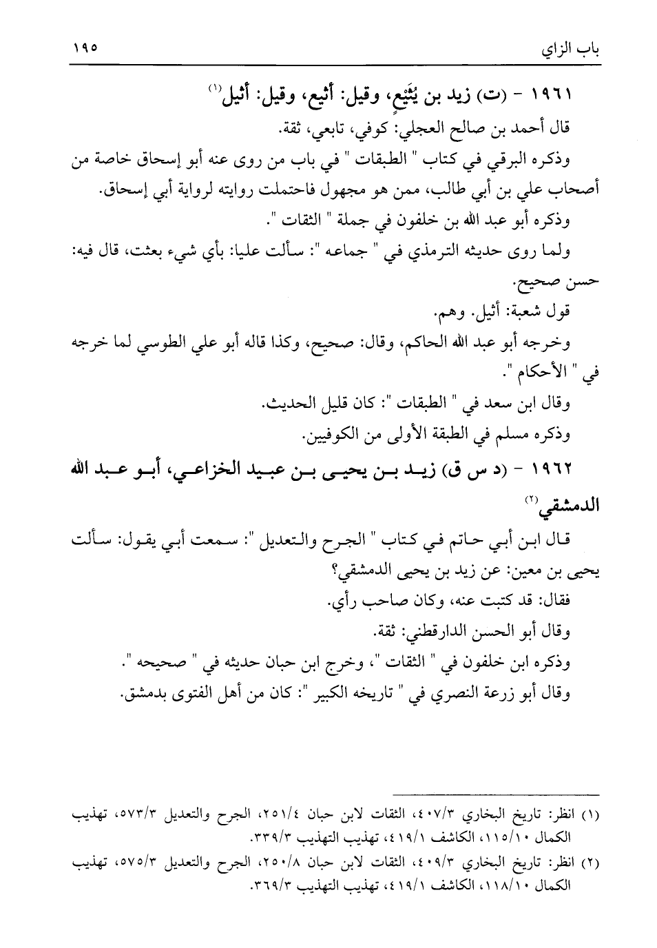 (¬٢) انظر: تاريخ البخاري ٣/ ٤٠٩، الثقات لابن حبان ٨/ ٢٥٠، الجرح والتعديل ٣/ ٥٧٥، تهذيب الكمال ١٠/ ١١٨، الكاشف ١/ ٤١٩، تهذيب التهذيب ٣/ ٣٦٩.