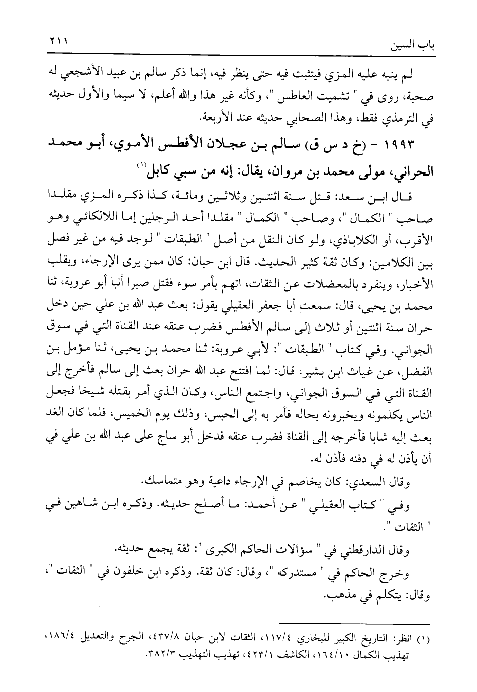 (¬١) انظر: التاريخ الكبير للبخاري ٤/ ١١٧، الثقات لابن حبان ٨/ ٤٣٧، الجرح والتعديل ٤/ ١٨٦، تهذيب الكمال ١٠/ ١٦٤، الكاشف ١/ ٤٢٣، تهذيب التهذيب ٣/ ٣٨٢.