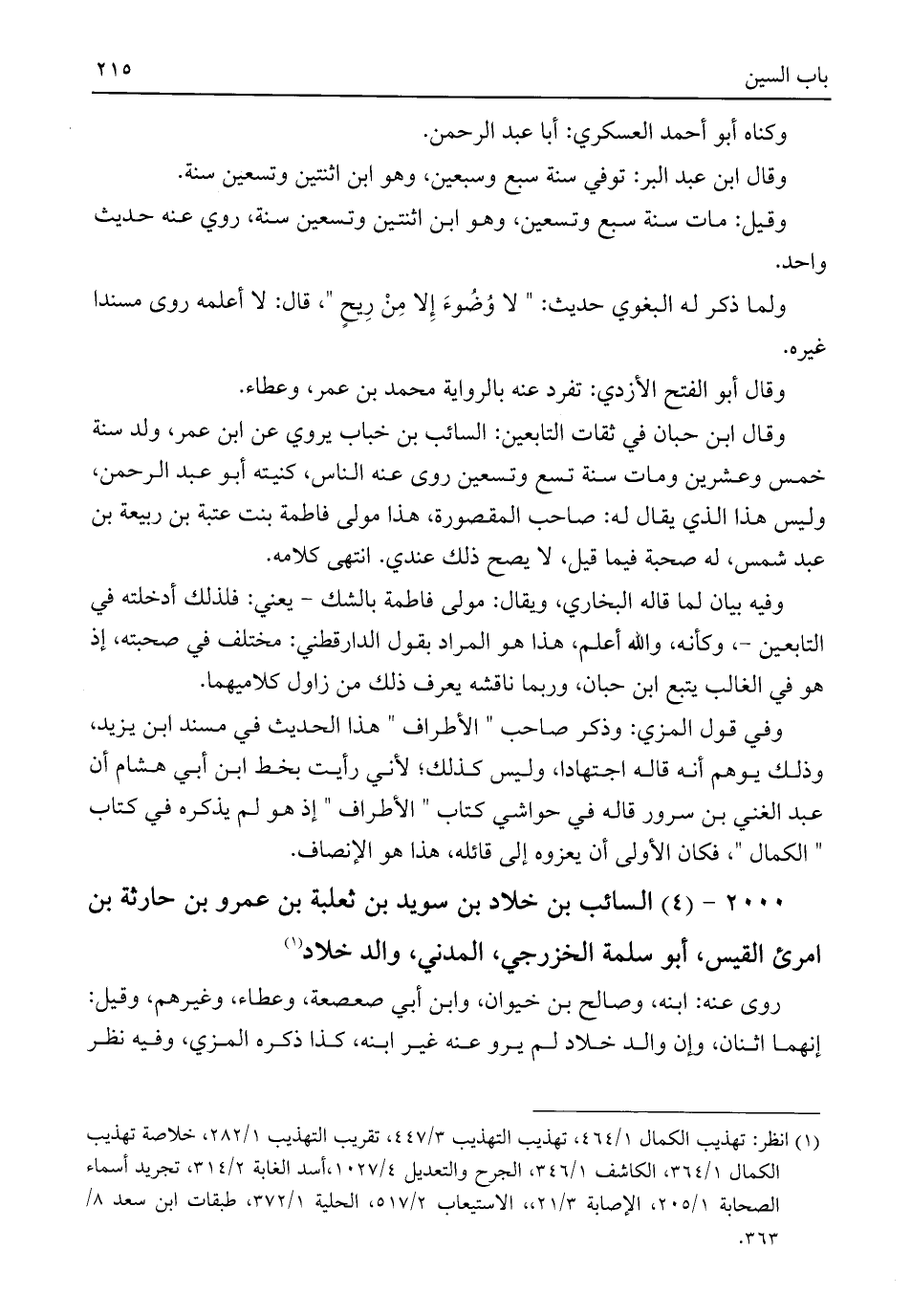 ٢٠٠٠ - (٤) السائب بن خلاد بن سويد بن ثعلبة بن عمرو بن حارثة بن امرئ القيس، أبو سلمة الخزرجي، المدني، والد خلاد (¬١)