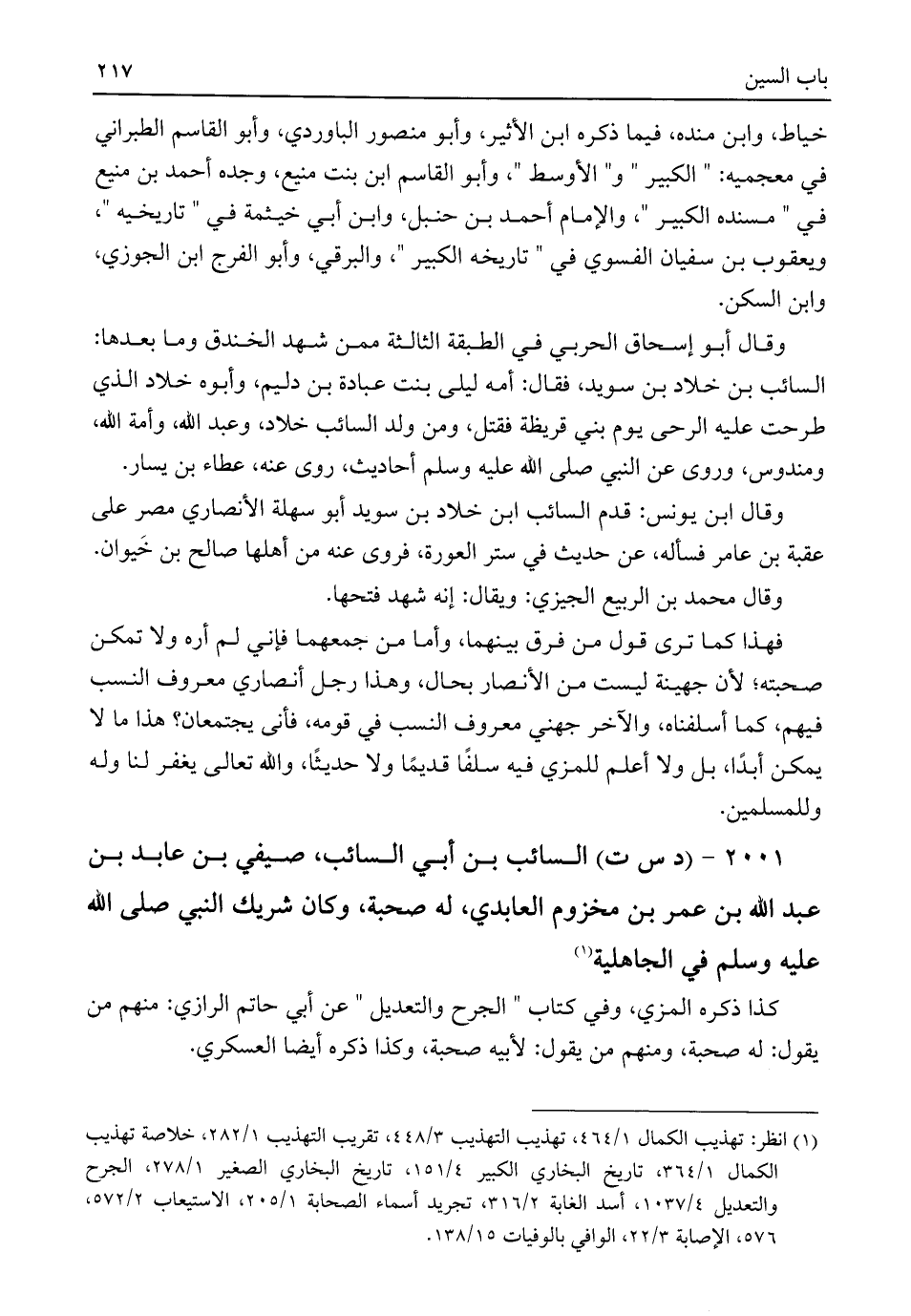 ٢٠٠١ - (د س ت) السائب بن أبي السائب، صيفي بن عابد بن عبد اللَّه بن عمر بن مخزوم العابدي، له صحبة، وكان شريك النبي صلى اللَّه عليه وسلم في الجاهلية (¬١)