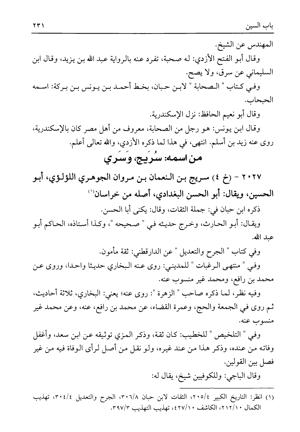 ٢٠٢٧ - (خ ٤) سريج بن النعمان بن مروان الجوهري اللؤلؤي، أبو الحسين، ويقال: أبو الحسن البغدادي، أصله من خراسان (¬١)