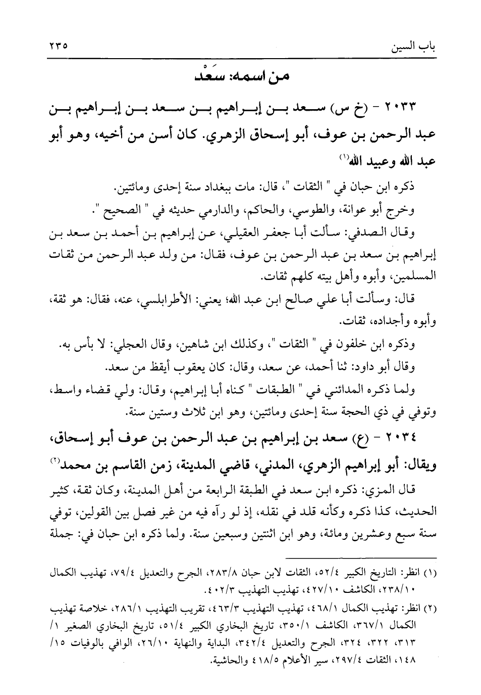 ٢٠٣٣ - (خ س) سعد بن إبراهيم بن سعد بن إبراهيم بن عبد الرحمن بن عوف، أبو إسحاق الزهري. كان أسن من أخيه، وهو أبو عبد اللَّه وعبيد اللَّه (¬١)