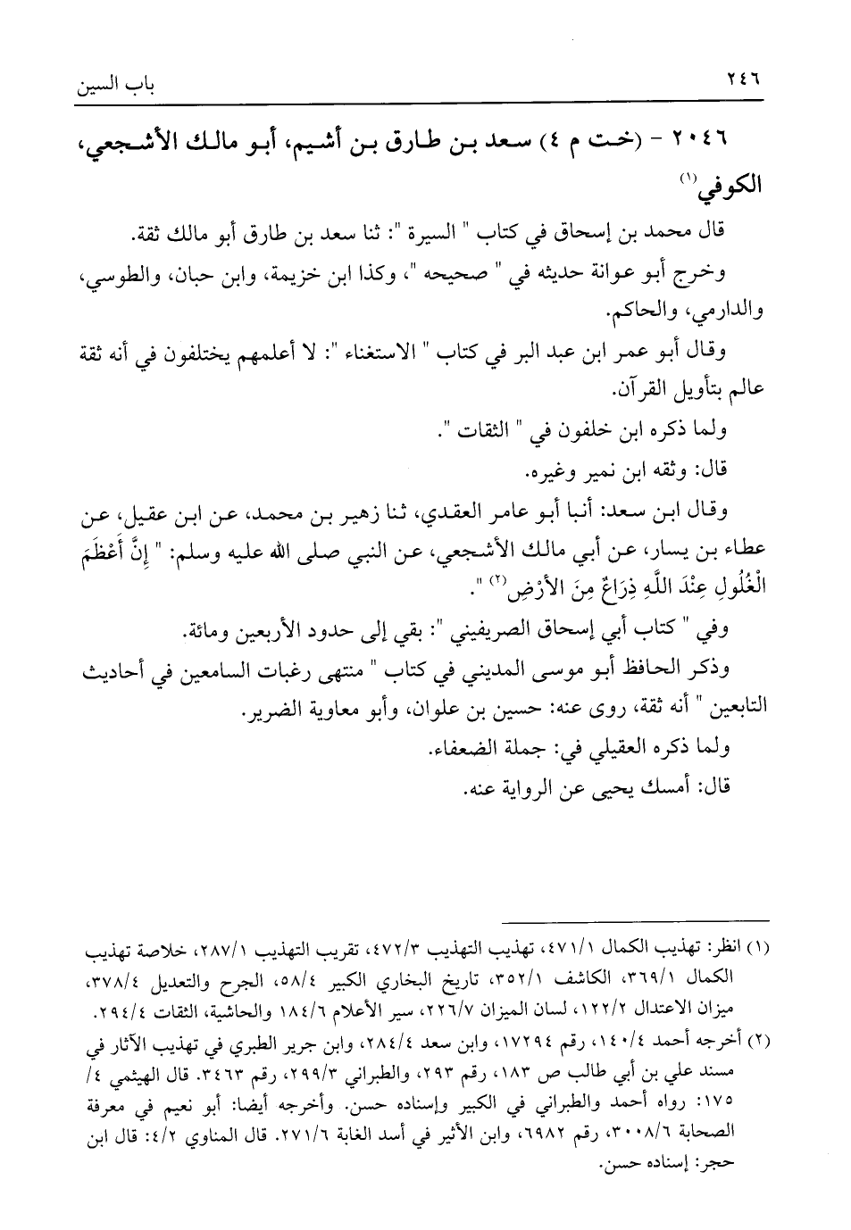 ٢٠٤٦ - (خت م ٤) سعد بن طارق بن أشيم، أبو مالك الأشجعي، الكوفي (¬١)