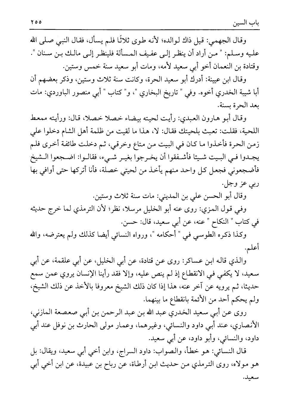 وقال الجهمي: قيل ذاك لوالده؛ لأنه طوى ثلاثًا فلم يسأل، فقال النبي صلى اللَّه عليه وسلم: "من أراد أن ينظر إلى عفيف المسألة فلينظر إلى مالك بن سنان". وقتادة بن النعمان أخو أبي سعيد لأمه، ومات أبو سعيد سنة خمس وستين.
