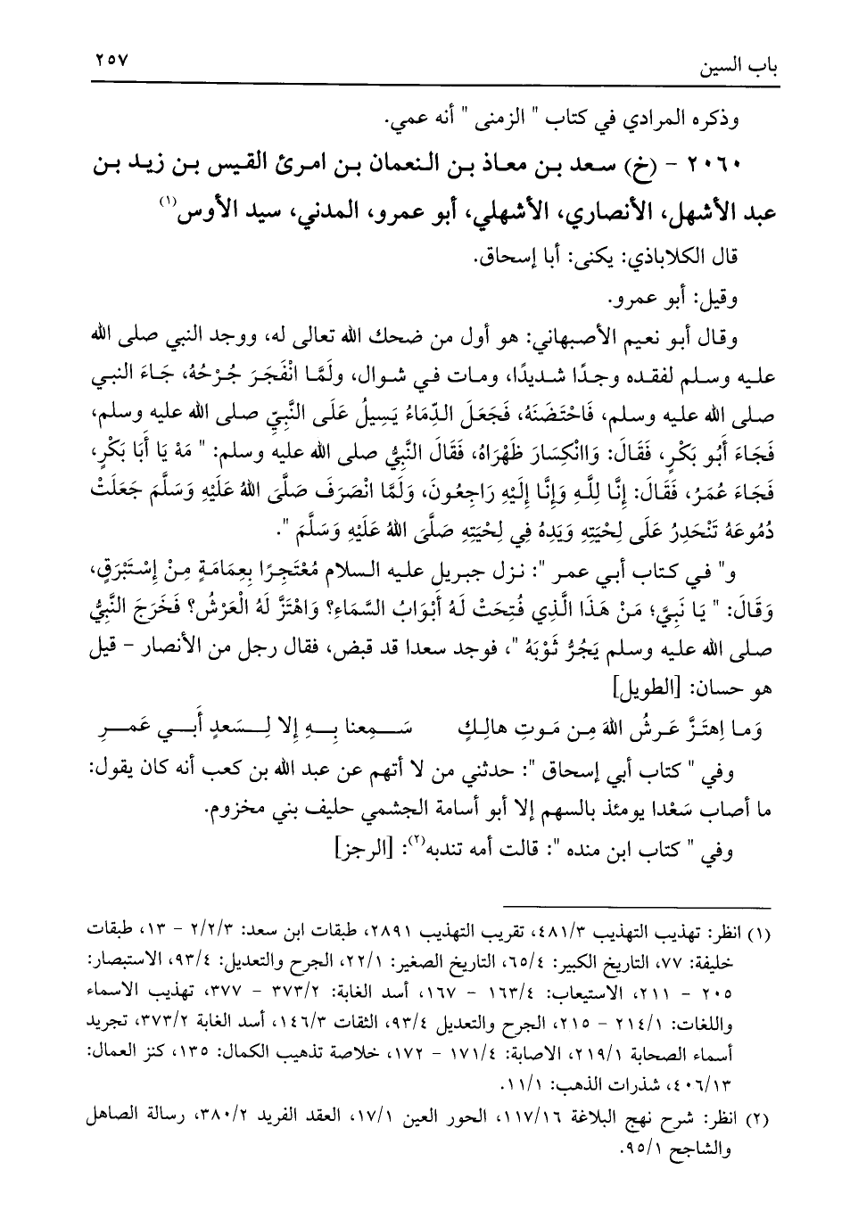 ٢٠٦٠ - (خ) سعد بن معاذ بن النعمان بن امرئ القيس بن زيد بن عبد الأشهل، الأنصاري، الأشهلي، أبو عمرو، المدني، سيد الأوس (¬١)