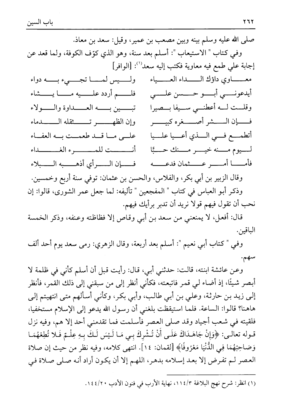 وفي كتاب "الاستيعاب": أسلم بعد سنة، وهو الذي كوّف الكوفة، ولما قعد عن إجابة علي طمع فيه معاوية فكتب إليه سعد (¬١): [الوافر]