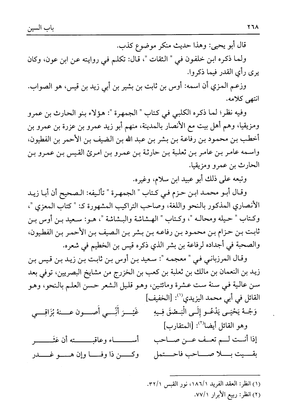 وقال المرزباني في "معجمه": سعيد بن أوس بن ثابت بن زيد بن قيس بن زيد بن النعمان بن مالك بن ثعلبة بن كعب بن الخزرج من مشايخ البصريين، توفي بعد سن عالية في سنة ست عشرة ومائتين، وهو قليل الشعر حسن العلم بالنحو، وهو القائل في أبي محمد اليزيدي (¬١): [الخفيف]