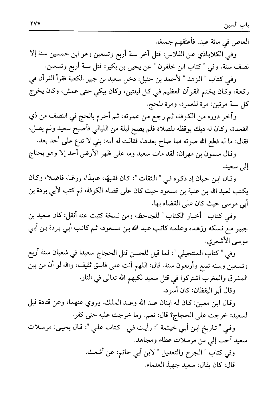 وفي كتاب "أخبار الكتاب" للجاحظ، ومن نسخة كتبت عنه أنقل: كان سعيد بن جبير مع نسكه وزهده وعلمه كاتب عبد اللَّه بن مسعود، ثم كاتب أبي بردة بن أبي موسى الأشعري.