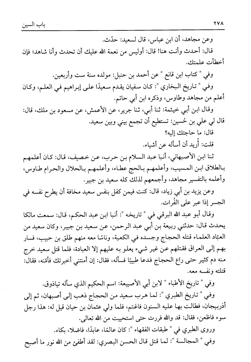 وقال أبو عبد اللَّه البرقي في "تاريخه": أنبا ابن عبد الحكم، قال: سمعت مالكا يحدث قال: حدثني ربيعة بن أبي عبد الرحمن، عن سعيد بن جبير، وكان سعيد من العبّاد العلماء قتله الحجاج وجسده في الكعبة، وناسًا معه منهم طلق بن حبيب، فسار بهم إلى العراق فقتلهم عن غير شيء يعلو به عليهم إلا العبادة، فلما قتل سعيد خرج منه دم كثير حتى راع الحجاج فدعا طبيبًا فسأله، فقال: إن أمنتني أخبرتك فأمّنه، فقال: قتلته ونفسه معه.