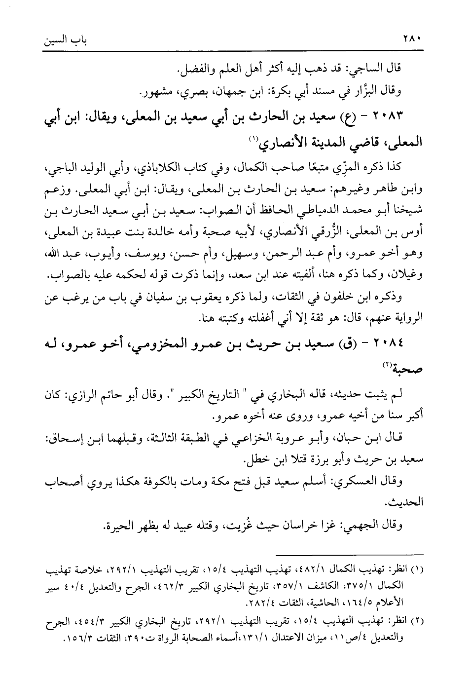 كذا ذكره المزِّي متبعًا صاحب الكمال، وفي كتاب الكلاباذي، وأبي الوليد الباجي، وابن طاهر وغيرهم: سعيد بن الحارث بن المعلى، ويقال: ابن أبي المعلى. وزعم شيخنا أبو محمد الدمياطي الحافظ أن الصواب: سعيد بن أبي سعيد الحارث بن أوس بن المعلى، الزُّرقي الأنصاري، لأبيه صحبة وأمه خالدة بنت عبيدة بن المعلى، وهو أخو عمرو، وأم عبد الرحمن، وسهيل، وأم حسن، ويوسف، وأيوب، عبد اللَّه، وغيلان، وكما ذكره هنا، ألفيته عند ابن سعد، وإنما ذكرت قوله لحكمه عليه بالصواب.