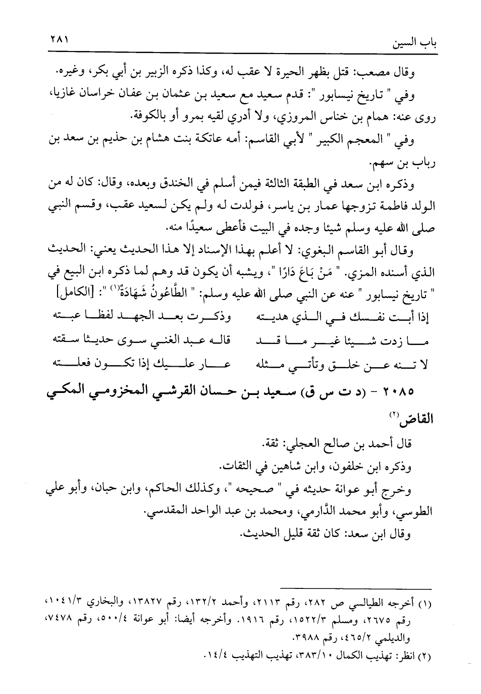 ٢٠٨٥ - (د ت س ق) سعيد بن حسان القرشي المخزومي المكي القاصّ (¬٢)