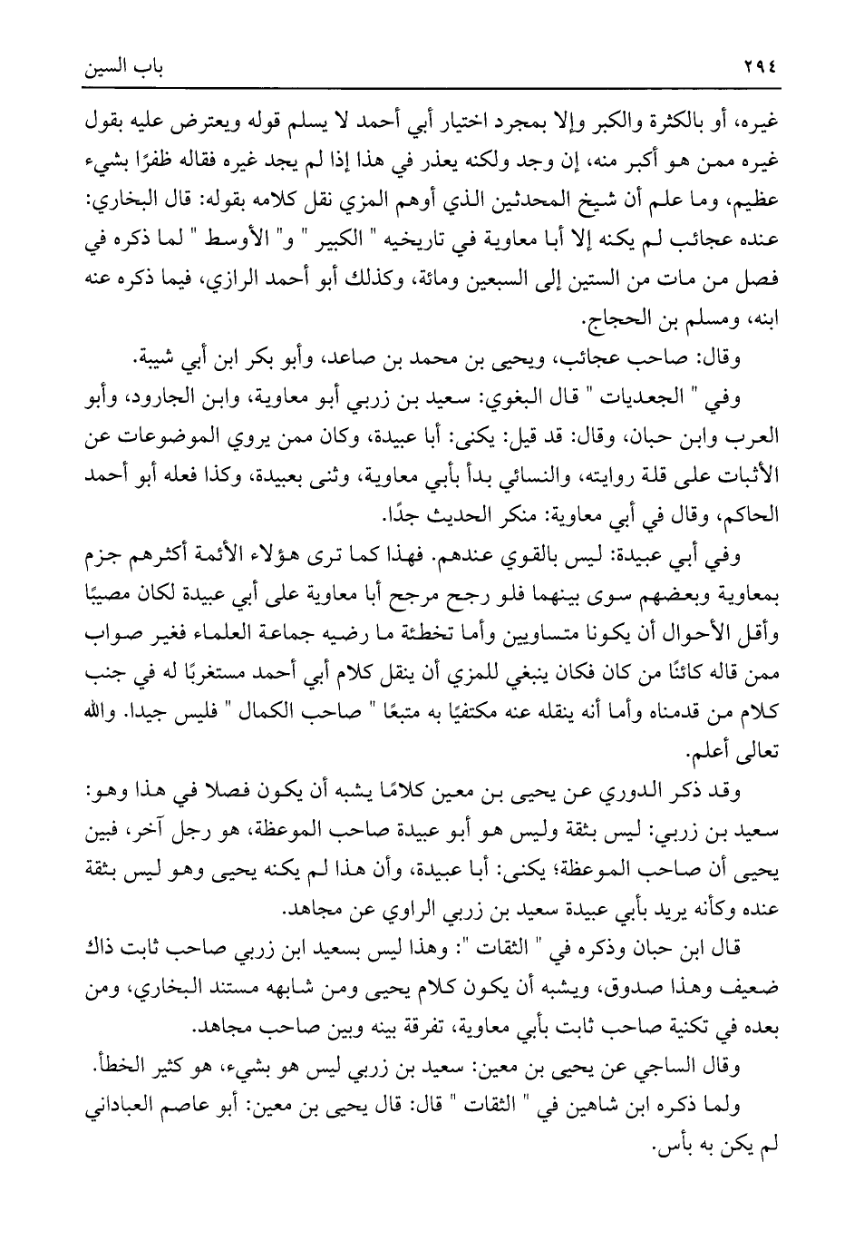 قال ابن حبان وذكره في "الثقات": وهذا ليس بسعيد ابن زربي صاحب ثابت ذاك ضعيف وهذا صدوق، ويشبه أن يكون كلام يحيى ومن شابهه مستند البخاري، ومن بعده في تكنية صاحب ثابت بأبي معاوية، تفرقة بينه وبين صاحب مجاهد.