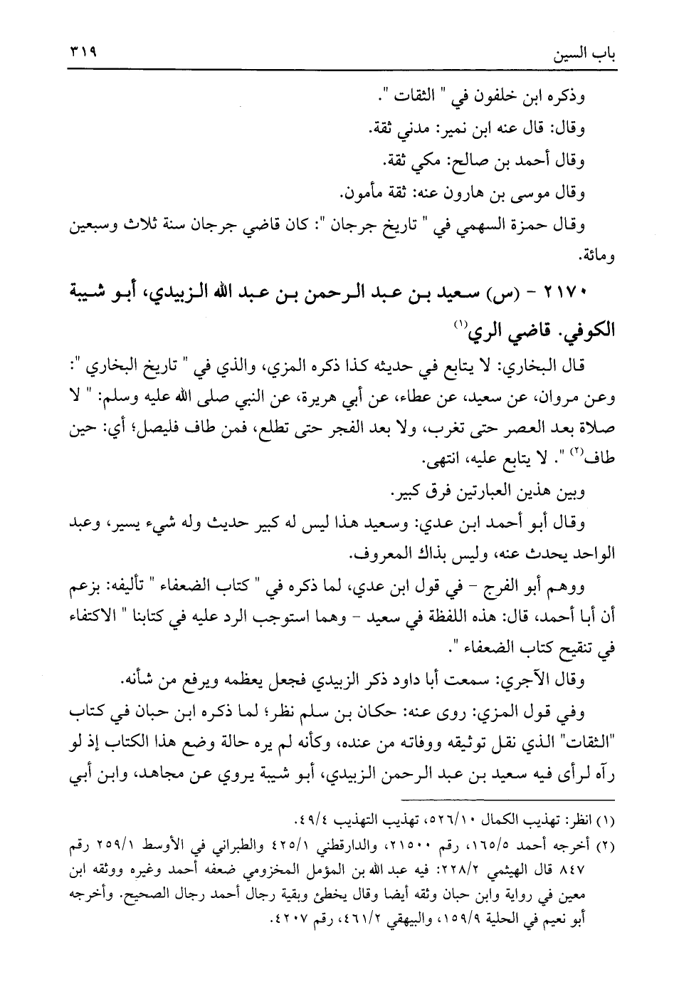 وفي قول المزي: روى عنه: حكان بن سلم نظر؛ لما ذكره ابن حبان في كتاب "الثقات" الذي نقل توثيقه ووفاته من عنده، وكأنه لم يره حالة وضع هذا الكتاب إذ لو رآه لرأى فيه سعيد بن عبد الرحمن الزبيدي، أبو شيبة يروي عن مجاهد، وابن أبي