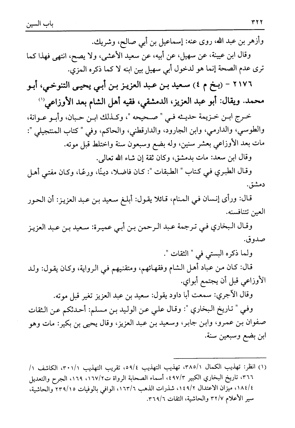 ٢١٧٦ - (بخ م ٤) سعيد بن عبد العزيز بن أبي يحيى التنوخي، أبو محمد. ويقال: أبو عبد العزيز، الدمشقي، فقيه أهل الشام بعد الأوزاعي (¬١)