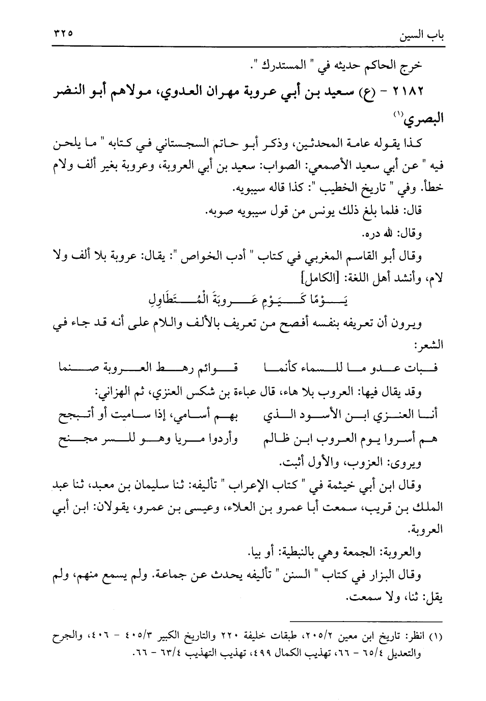 كذا يقوله عامة المحدثين، وذكر أبو حاتم السجستاني في كتابه "ما يلحن فيه" عن أبي سعيد الأصمعي: الصواب: سعيد بن أبي العروبة، وعروبة بغير ألف ولام خطأ. وفي "تاريخ الخطيب": كذا قاله سيبويه.