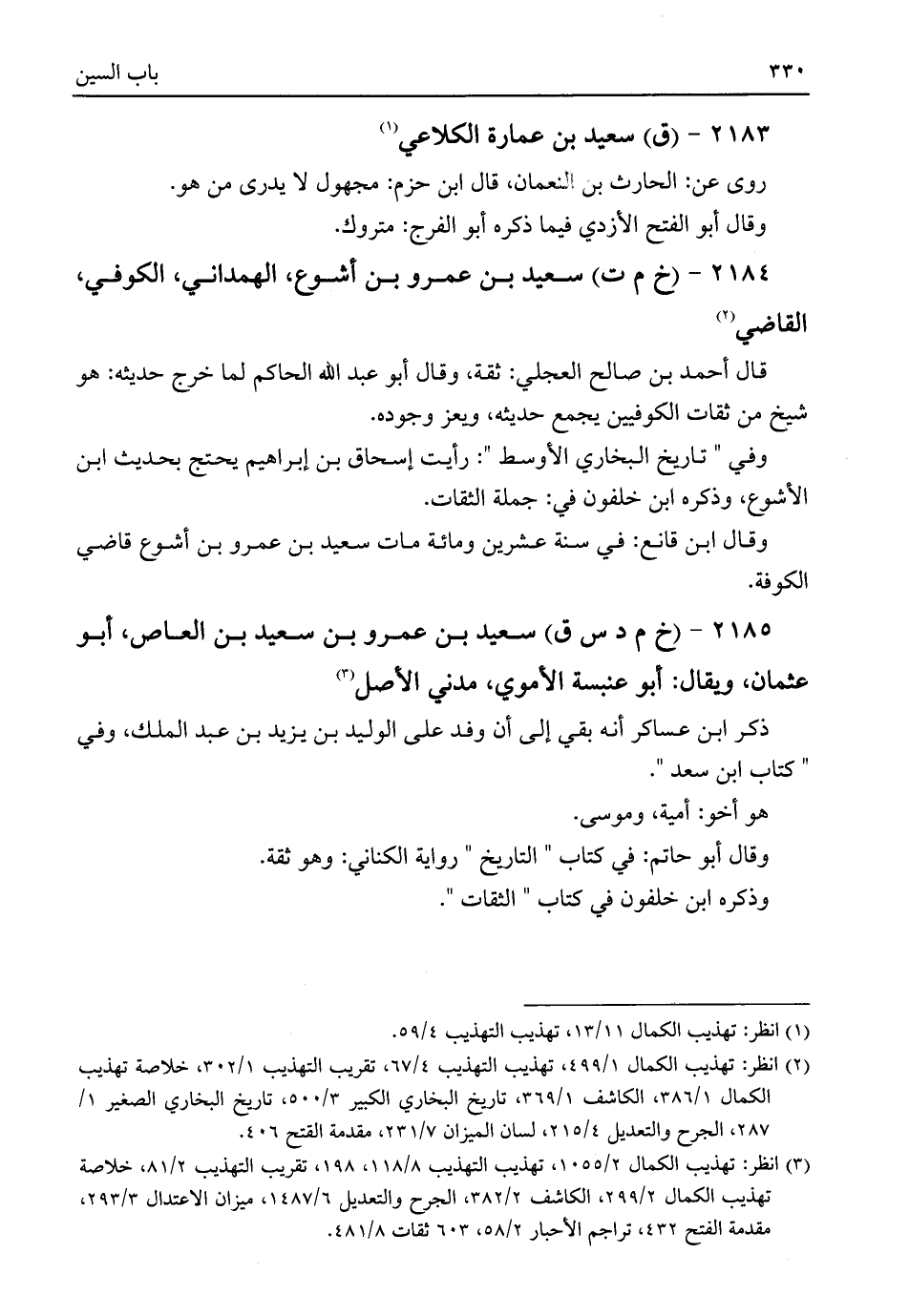 (¬٣) انظر: تهذيب الكمال ٢/ ١٠٥٥، تهذيب التهذيب ٨/ ١١٨، ١٩٨، تقريب التهذيب ٢/ ٨١، خلاصة تهذيب الكمال ٢/ ٢٩٩، الكاشف ٢/ ٣٨٢، الجرح والتعديل ٦/ ١٤٨٧، ميزان الاعتدال ٣/ ٢٩٣، مقدمة الفتح ٤٣٢، تراجم الأحبار ٢/ ٥٨، ٦٠٣ ثقات ٨/ ٤٨١.