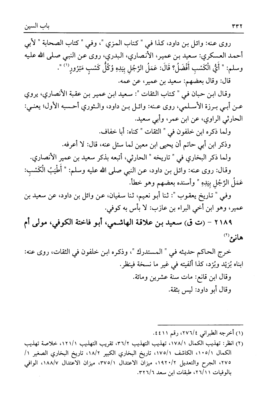 وقال ابن حبان في "كتاب الثقات": سعيد ابن عمير بن عقبة الأنصاري، يروي عن أبي برزة الأسلمي، روى عنه: وائل بن داود، والثوري أحسبه الأول؛ يعني: الحارثي الراوي، عن ابن عمر، وأبي سعيد.