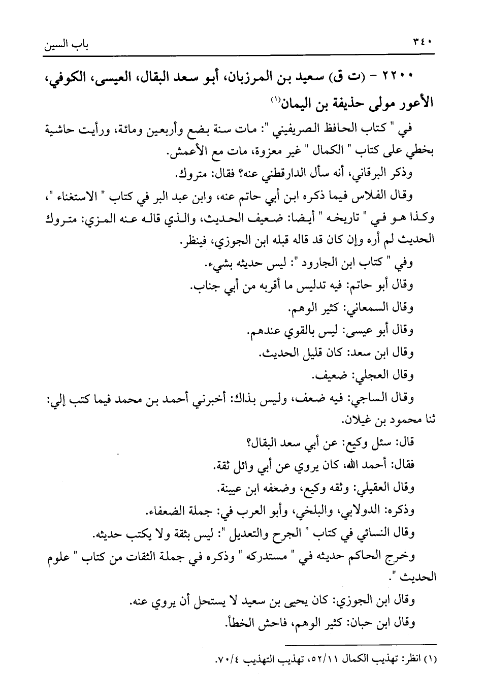 ٢٢٠٠ - (ت ق) سعيد بن المرزبان، أبو سعد البقال، العيسى، الكوفي، الأعور مولى حذيفة بن اليمان (¬١)