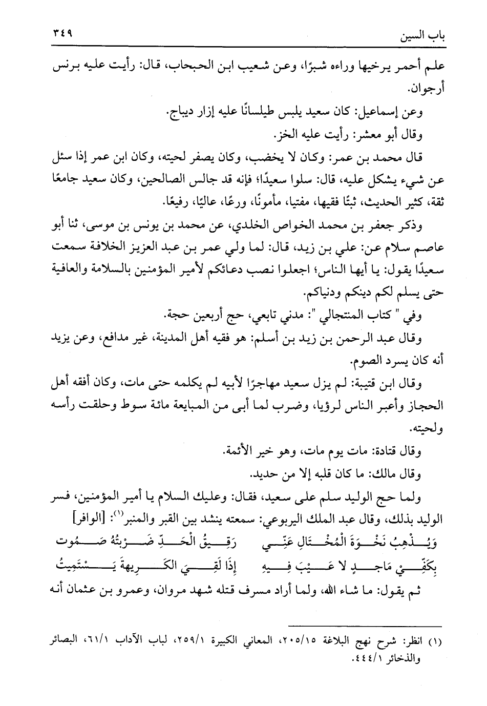 وعن إسماعيل: كان سعيد يلبس طيلسانًا عليه إزار ديباج.