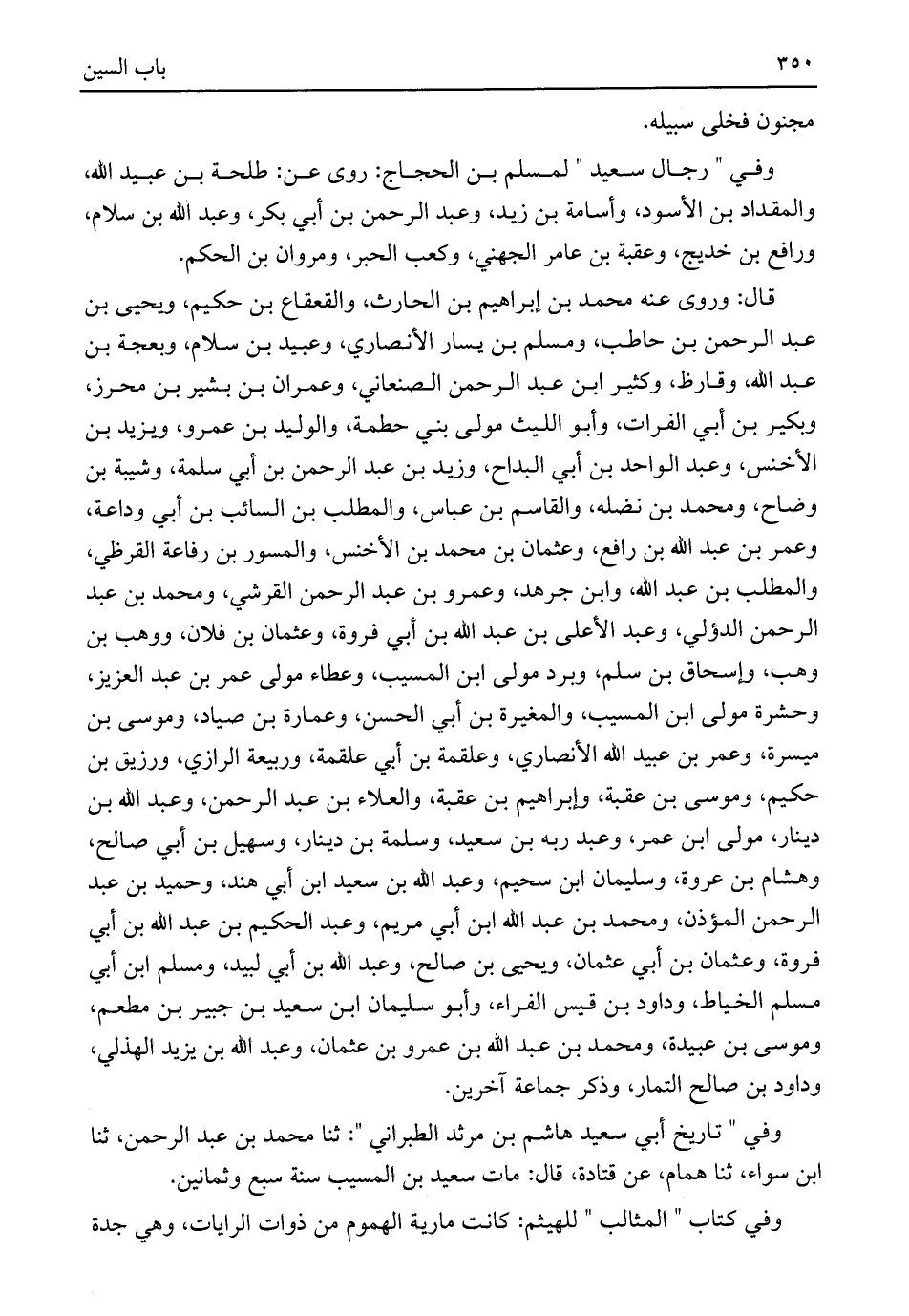 وفي "رجال سعيد" لمسلم بن الحجاج: روى عن: طلحة بن عبيد اللَّه، والمقداد بن الأسود، وأسامة بن زيد، وعبد الرحمن بن أبي بكر، وعبد اللَّه بن سلام، ورافع بن خديج، وعقبة بن عامر الجهني، وكعب الحبر، ومروان بن الحكم.