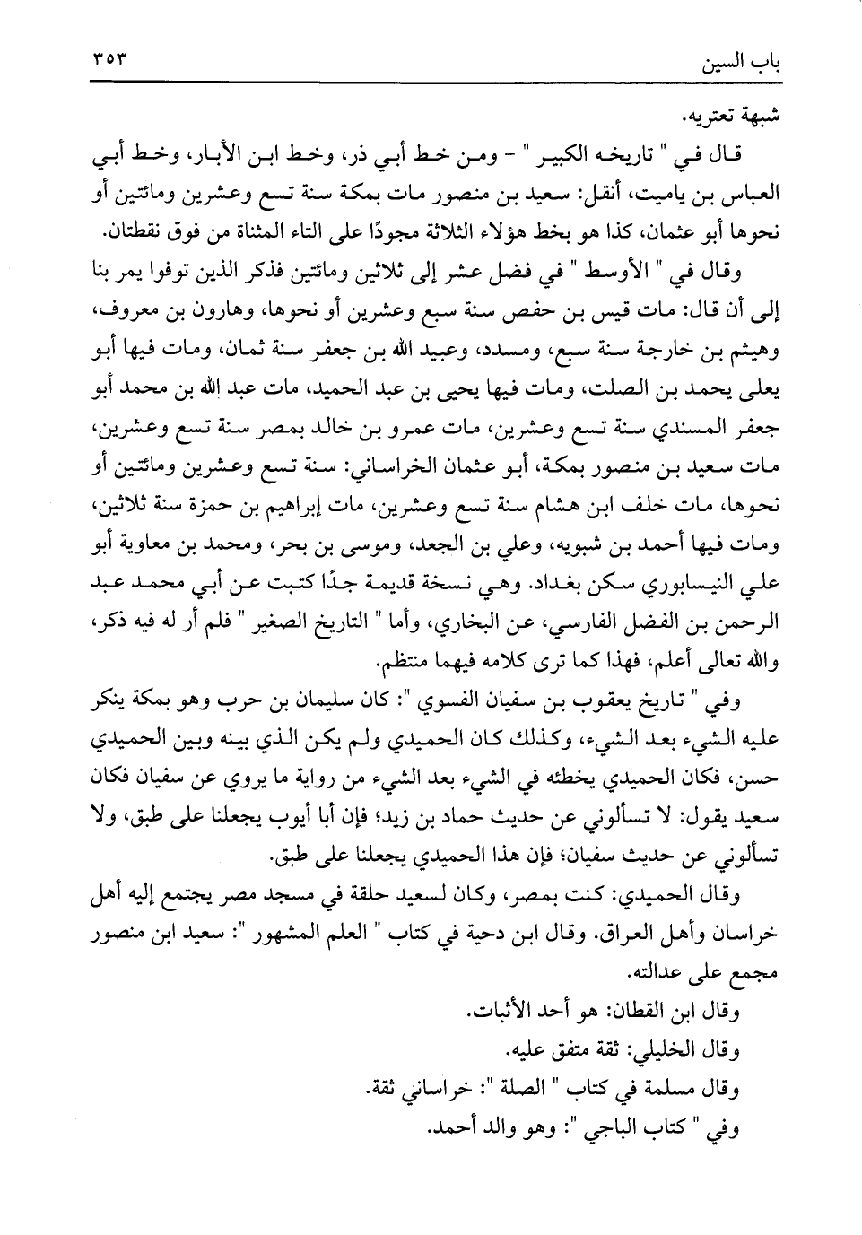 قال في "تاريخه الكبير" - ومن خط أبي ذر، وخط ابن الأبار، وخط أبي العباس بن ياميت، أنقل: سعيد بن منصور مات بمكة سنة تسع وعشرين ومائتين أو نحوها أبو عثمان، كذا هو بخط هؤلاء الثلاثة مجودًا على التاء المثناة من فوق نقطتان.