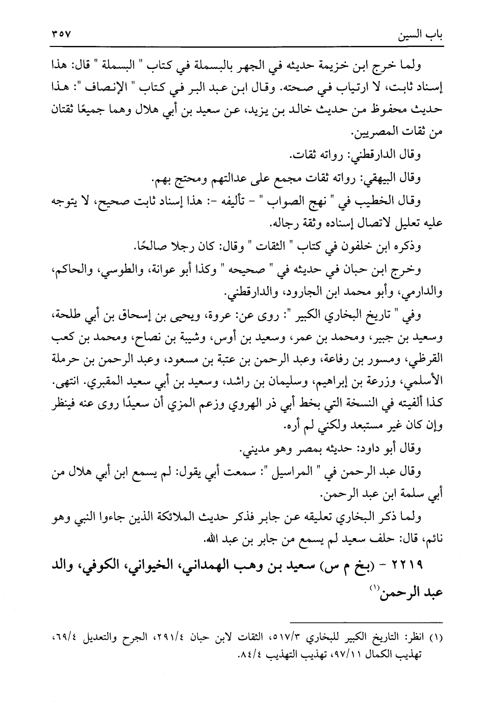 ولما خرج ابن خزيمة حديثه في الجهر بالبسملة في كتاب "البسملة" قال: هذا إسناد ثابت، لا ارتياب في صحته. وقال ابن عبد البر في كتاب "الإنصاف": هذا حديث محفوظ من حديث خالد بن يزيد، عن سعيد بن أبي هلال وهما جميعًا ثقتان من ثقات المصريين.