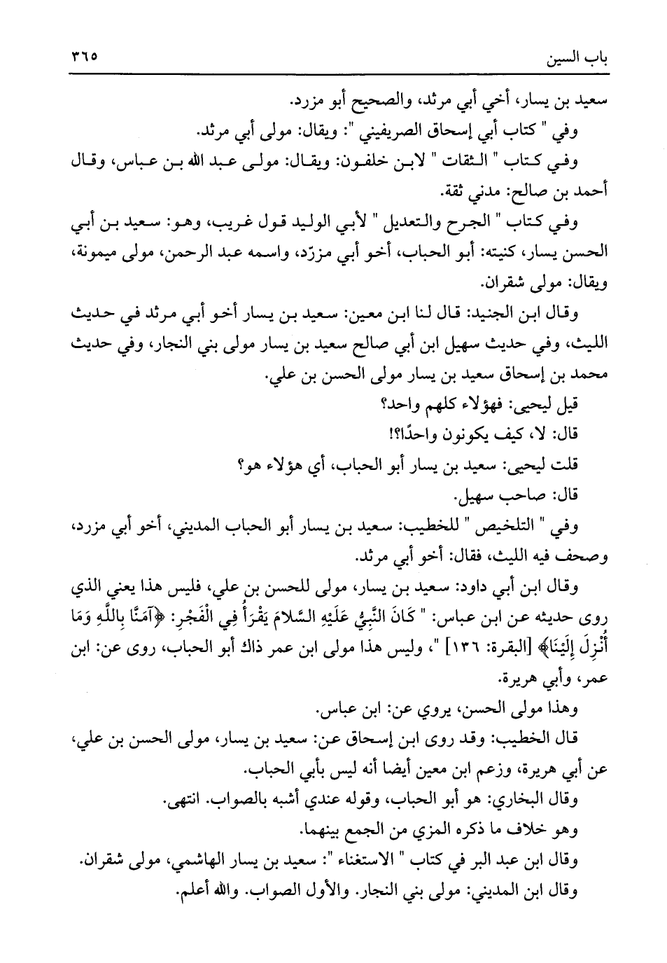 وقال ابن أبي داود: سعيد بن يسار، مولى للحسن بني علي، فليس هذا يعني الذي روى حديثه عن ابن عباس: "كَانَ النَّبِيُّ عَلَيْهِ السَّلامَ يَقْرَأُ فِي الْفَجْرِ: {آمَنَّا بِاللَّهِ وَمَا أُنْزِلَ إِلَيْنَا} [البقرة: ١٣٦] "، وليس هذا مولى ابن عمر ذاك أبو الحباب، روى عن: ابن عمر، وأبي هريرة.