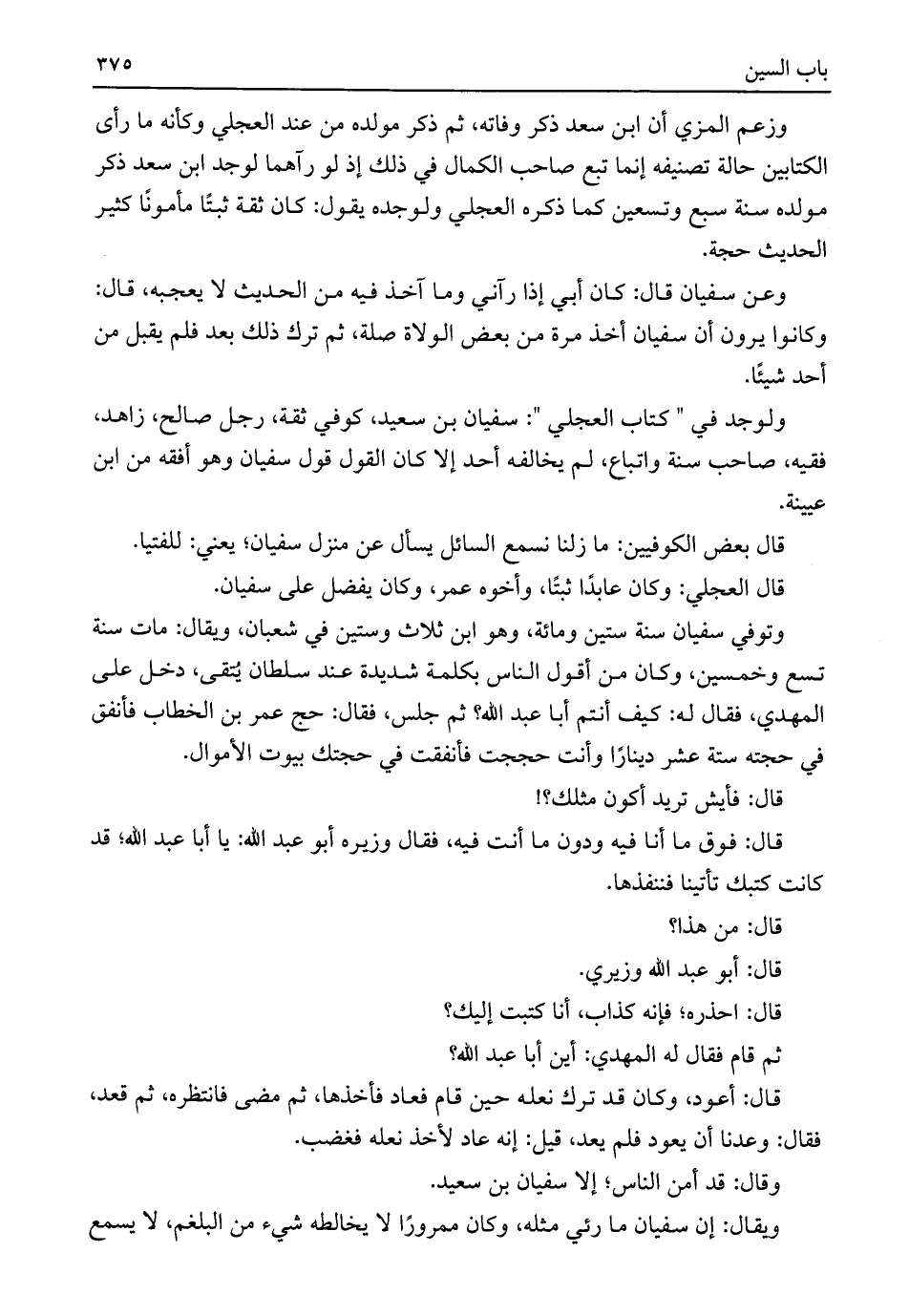 ولوجد في "كتاب العجلي": سفيان بن سعيد، كوفي ثقة، رجل صالح، زاهد، فقيه، صاحب سنة واتباع، لم يخالفه أحد إلا كان القول قول سفيان وهو أفقه من ابن عيينة.