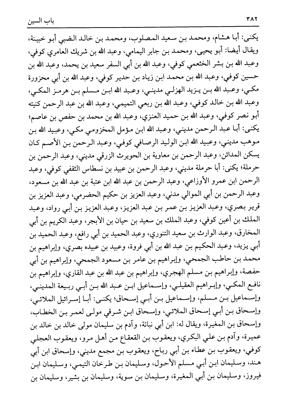 يكنى: أبا هشام، ومحمد بن سعيد المصلوب، ومحمد بن خالد الضبي أبو خبينة، ويقال أيضًا: أبو يحيى، ومحمد بن جابر اليمامي، وعبد اللَّه بن شريك العامري كوفي، وعبد اللَّه بن بشر الخثعمي كوفي، وعبد اللَّه بن أبي السفر سعيد بن يحمد، وعبد اللَّه بن حسين كوفي، وعبد اللَّه بن محمد ابن زياد بن حدير كوفي، وعبد اللَّه بن أبي محزورة مكي، وعبد اللَّه بن يزيد الهزلي مديني، وعبد اللَّه ابن مسلم بن هرمز المكي، وعبد اللَّه بن خالد كوفي، وعبد اللَّه بن ربعي التميمي، وعبد اللَّه بن عبد الرحمن كنيته أبو نصر كوفي، وعبد اللَّه بن حميد العنزي، وعبد اللَّه بن محمد بن حفص بن عاصم؛ يكنى: أبا عبد الرحمن مديني، وعبد اللَّه ابن مؤمل المخزومي مكي، وعبيد اللَّه بن موهب مديني، وعبيد اللَّه ابن الوليد الرصافي كوفي، وعبد الرحمن بن الأصم كان يسكن المدائن، وعبد الرحمن بن معاوية بن الحويرث الزرقي مديني، وعبد الرحمن بن حرملة؛ يكنى: أبا حرملة مديني، وعبد الرحمن بن عبيد بن نسطاس الثقفي كوفي، وعبد الرحمن ابن عمرو الأوزاعي، وعبد الرحمن بن عبد اللَّه ابن عتبة بن عبد اللَّه بن مسعود، وعبد الرحمن بن أبي الموالي مدني، وعبد العزيز بن حكيم الحضرمي، وعبد العزيز بن قرير بصري، وعبد العزيز بن عمر بن عبد العزيز، وعبد العزيز بن أبي رواد، وعبد الملك بن أعين كوفي، وعبد الملك بن سعيد بن حيان بن الأبجر، وعبد الكريم بن أبي المخارق، وعبد الوارث بن سعيد التنوري، وعبد الحميد بن أبي رأفع، وعبد الحميد بن أبي يزيد، وعبد الحكيم بن عبد اللَّه بن أبي فروة، وعبيد بن عبيده بصري، وإبراهيم بن محمد بن حاطب الجمحي، وإبراهيم بن عامر بن مسعود الجمحي، وإبراهيم بن أبي حفصة، وإبراهيم بن مسلم الهجري، وإبراهيم بن عبد اللَّه بن عبد القاري، وإبراهيم بن نافع المكي، وإبراهيم العقيلي، وإسماعيل ابن عبد اللَّه بن أبي ربيعة المديني، وإسماعيل بن مسلم، وإسماعيل بن أبي إسحاق؛ يكنى: أبا إسرائيل الملائي، وإسحاق بن أبي إسحاق الملائي، وإسحاق ابن شرقي مولى لعمر بن الخطاب، وإسحاق بن المغيرة، ويقال له: ابن أبي نباتة، وآدم بن سليمان مولى خالد بن خالد بن عميرة، وآدم بن علي البكري، ويعقوب بن القعقاع من أهل مرو، ويعقوب العجلي كوفي، ويعقوب بن عطاء بن أبي رباح، ويعقوب بن مجمع مديني، وإسحاق ابن أبي هند، وسليمان ابن أبي مسلم الأحول، وسليمان بن طرخان التيمي، وسليمان ابن فيروز، وسليمان بن أبي المغيرة، وسليمان بن سوية، وسليمان بن بشير، وسليمان بن