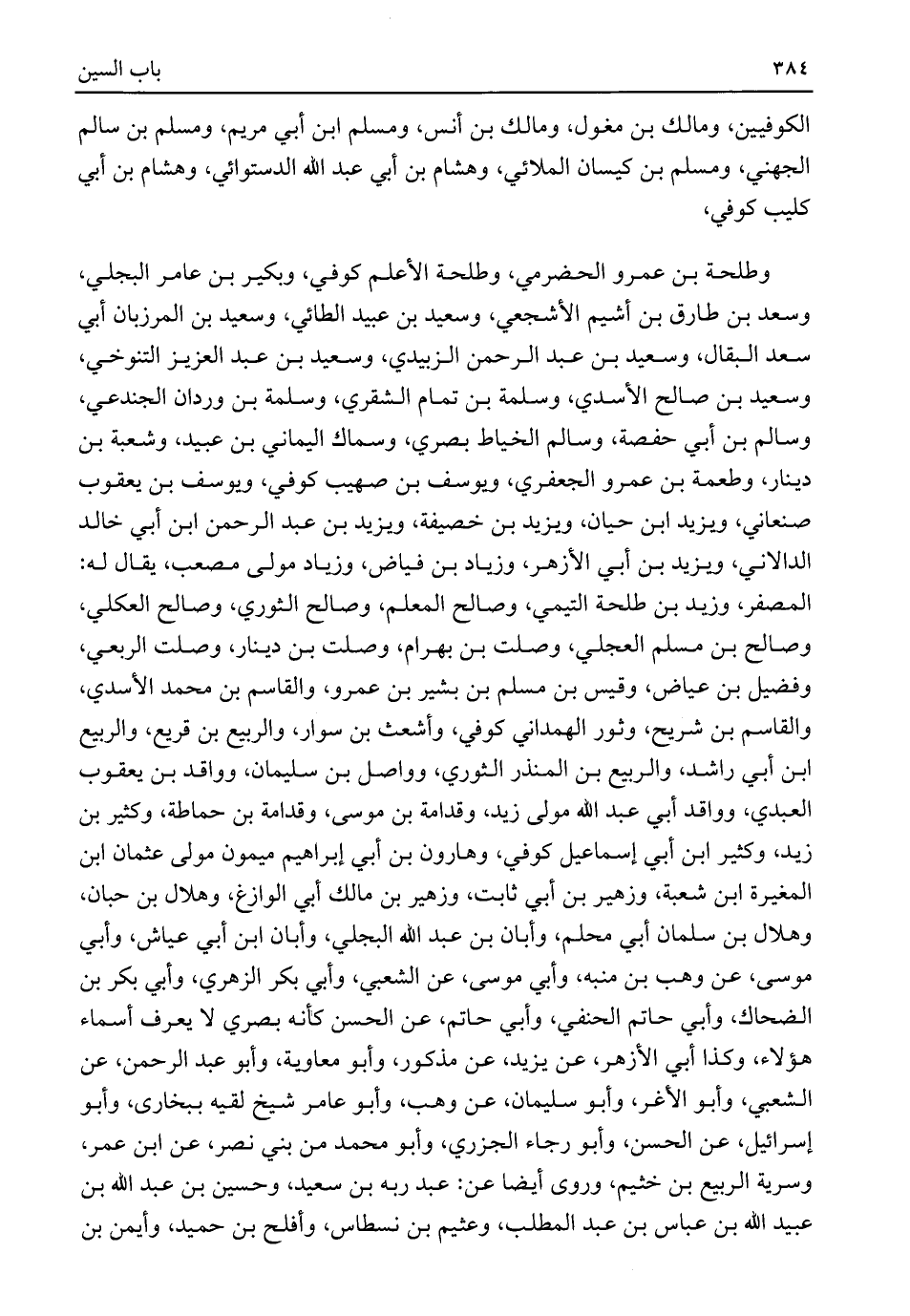 الكوفيين، ومالك بن مغول، ومالك بن أنس، ومسلم ابن أبي مريم، ومسلم بن سالم الجهني، ومسلم بن كيسان الملائي، وهشام بن أبي عبد اللَّه الدستوائي، وهشام بن أبي كليب كوفي،