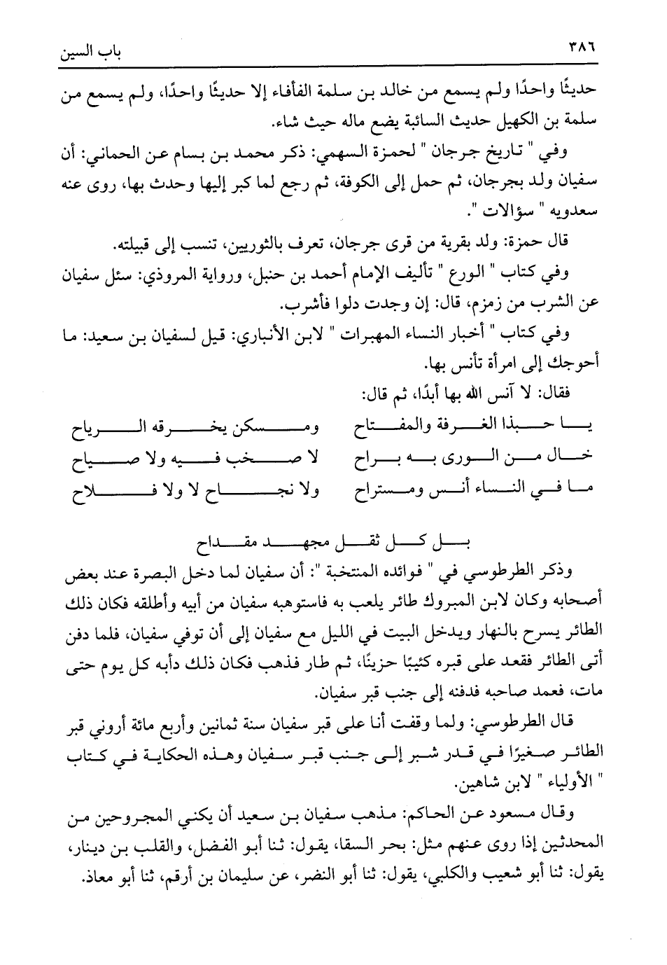 وفي "تاريخ جرجان" لحمزة السهمي: ذكر محمد بن بسام عن الحماني: أن سفيان ولد بجرجان، ثم حمل إلى الكوفة، ثم رجع لما كبر إليها وحدث بها، روى عنه سعدويه "سؤالات".