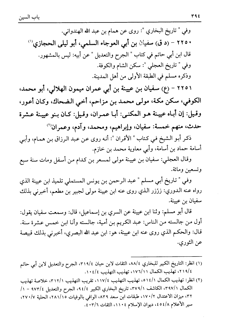 وقال العجلي: سفيان بن عيينة مولى لمسعر بن كدام من أسفل ومات سنة سبع وتسعين ومائة.