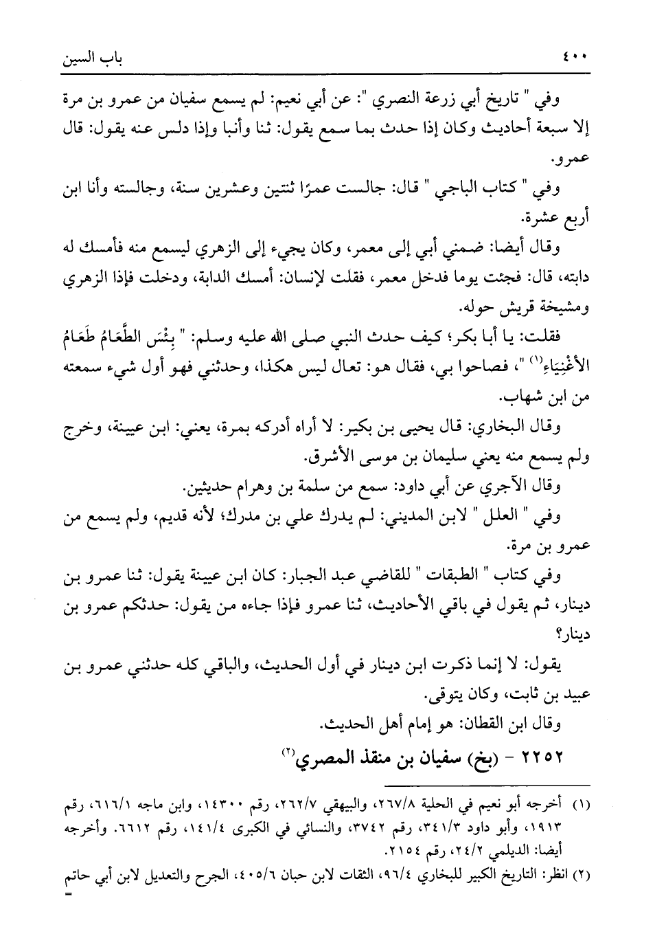 وفي كتاب "الطبقات" للقاضي عبد الجبار: كان ابن عيينة يقول: ثنا عمرو بن دينار، ثم يقول في باقي الأحاديث، ثنا عمرو فإذا جاءه من يقول: حدثكم عمرو بن دينار؟