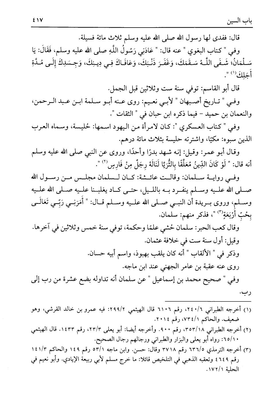 (¬٣) أخرجه الترمذي ٥/ ٦٣٦ رقم ٣٧١٨ وقال: حسن. وابن ماجه ١/ ٥٣ رقم ١٤٩ والحاكم ٣/ ١٤١ رقم ٤٦٤٩ وتعقبه الذهبي في التلخيص قائلا: ما خرج مسلم لأبي ربيعة الإيادي. وأبو نعيم في الحلية ١/ ٧٢١.
