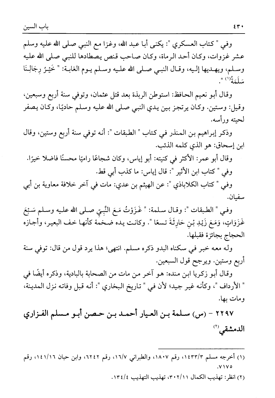 ٢٢٩٧ - (س) سلمة بن العيار أحمد بن حصن أبو مسلم الفزاري الدمشقي (¬٢)