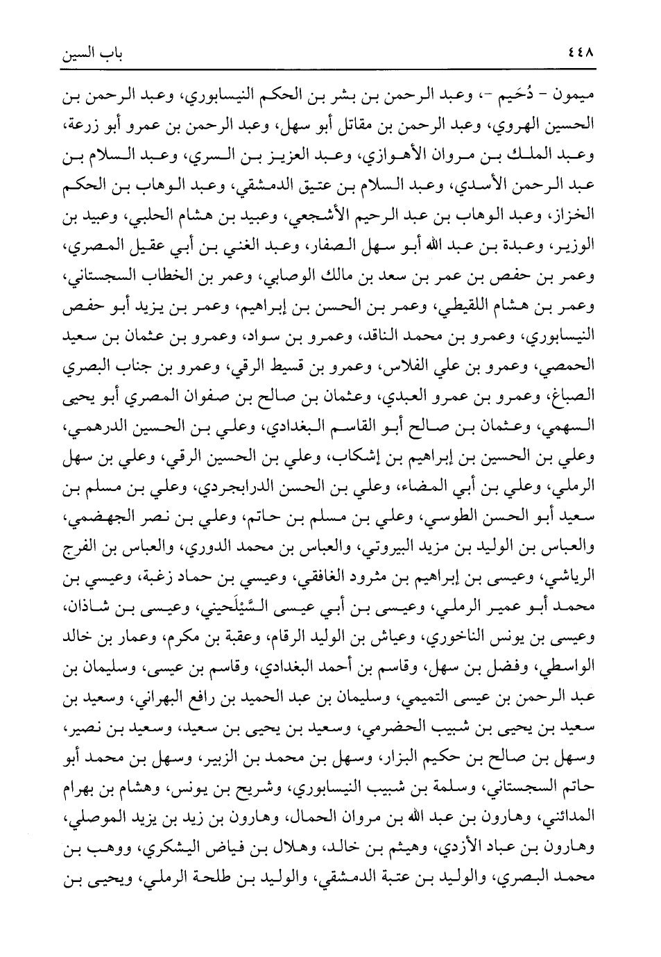 ميمون -دُحَيم-، وعبد الرحمن بن بشر بن الحكم النيسابوري، وعبد الرحمن بن الحسين الهروي، وعبد الرحمن بن مقاتل أبو سهل، وعبد الرحمن بن عمرو أبو زرعة، وعبد الملك بن مروان الأهوازي، وعبد العزيز بن السري، وعبد السلام بن عبد الرحمن الأسدي، وعبد السلام بن عتيق الدمشقي، وعبد الوهاب بن الحكم الخزاز، وعبد الوهاب بن عبد الرحيم الأشجعي، وعبيد بن هشام الحلبي، وعبيد بن الوزير، وعبدة بن عبد اللَّه أبو سهل الصفار، وعبد الغني بن أبي عقيل المصري، وعمر بن حفص بن عمر بن سعد بن مالك الوصابي، وعمر بن الخطاب السجستاني، وعمر بن هشام اللقيطي، وعمر بن الحسن بن إبراهيم، وعمر بن يزيد أبو حفص النيسابوري، وعمرو بن محمد الناقد، وعمرو بن سواد، وعمرو بن عثمان بن سعيد الحمصي، وعمرو بن علي الفلاس، وعمرو بن قسيط الرقي، وعمرو بن جناب البصري الصباغ، وعمرو بن عمرو العبدي، وعثمان بن صالح بن صفوان المصري أبو يحيى السهمي، وعثمان بن صالح أبو القاسم البغدادي، وعلي بن الحسين الدرهمي، وعلي بن الحسين بن إبراهيم بن إشكاب، وعلي بن الحسين الرقي، وعلي بن سهل الرملي، وعلي بن أبي المضاء، وعلي بن الحسن الدرابجردي، وعلي بن مسلم بن سعيد أبو الحسن الطوسي، وعلي بن مسلم بن حاتم، وعلي بن نصر الجهضمي، والعباس بن الوليد بن مزيد البيروتي، والعباس بن محمد الدوري، والعباس بن الفرج الرياشي، وعيسى بن إبراهيم بن مثرود الغافقي، وعيسى بن حماد زغبة، وعيسى بن محمد أبو عمير الرملي، وعيسى بن أبي عيسى السَّيْلَحيني، وعيسى بن شاذان، وعيسى بن يونس الناخوري، وعياش بن الوليد الرقام، وعقبة بن مكرم، وعمار بن خالد الواسطي، وفضل بن سهل، وقاسم بن أحمد البغدادي، وقاسم بن عيسى، وسليمان بن عبد الرحمن بن عيسى التميمي، وسليمان بن عبد الحميد بن رافع البهراني، وسعيد بن سعيد بن يحيى بن شبيب الحضرمي، وسعيد بن يحيى بن سعيد، وسعيد بن نصير، وسهل بن صالح بن حكيم البزار، وسهل بن محمد بن الزبير، وسهل بن محمد أبو حاتم السجستاني، وسلمة بن شبيب النيسابوري، وشريح بن يونس، وهشام بن بهرام المدائني، وهارون بن عبد اللَّه بن مروان الحمال، وهارون بن زيد بن يزيد الموصلي، وهارون بن عباد الأزدي، وهيثم بن خالد، وهلال بن فياض اليشكري، ووهب بن محمد البصري، والوليد بن عتبة الدمشقي، والوليد بن طلحة الرملي، ويحيى بن