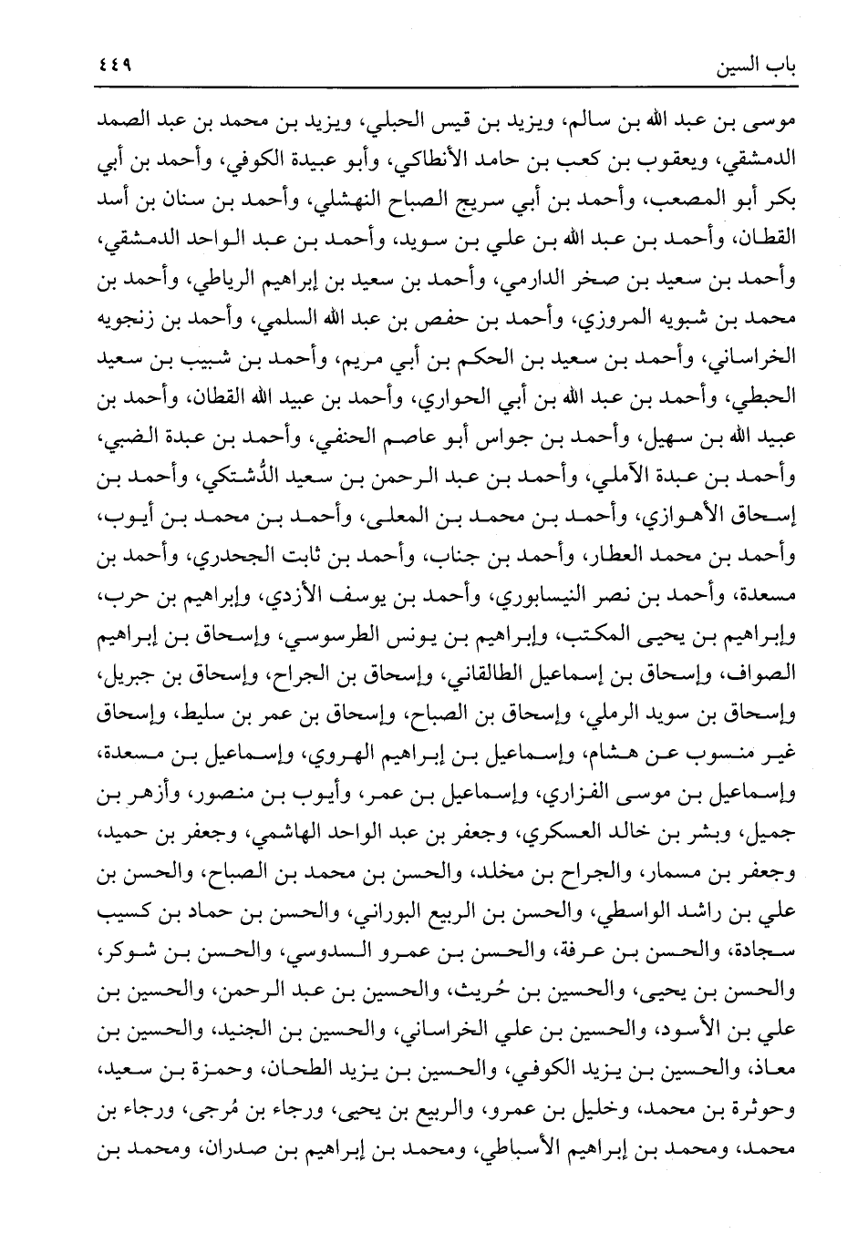 موسى بن عبد اللَّه بن سالم، ويزيد بن قيس الحبلي، ويزيد بن محمد بن عبد الصمد الدمشقي، ويعقوب بن كعب بن حامد الأنطاكي، وأبو عبيدة الكوفي، وأحمد بن أبي بكر أبو المصعب، وأحمد بن أبي سريج الصباح النهشلي، وأحمد بن سنان بن أسد القطان، وأحمد بن عبد اللَّه بن علي بن سويد، وأحمد بن عبد الواحد الدمشقي، وأحمد بن سعيد بن صخر الدارمي، وأحمد بن سعيد بن إبراهيم الرياطي، وأحمد بن محمد بن شبويه المروزي، وأحمد بن حفص بن عبد اللَّه السلمي، وأحمد بن زنجويه الخراساني، وأحمد بن سعيد بن الحكم بن أبي مريم، وأحمد بن شبيب بن سعيد الحبطي، وأحمد بن عبد اللَّه بن أبي الحواري، وأحمد بن عبيد اللَّه القطان، وأحمد بن عبيد اللَّه بن سهيل، وأحمد بن جواس أبو عاصم الحنفي، وأحمد بن عبدة الضبي، وأحمد بن عبدة الآملي، وأحمد بن عبد الرحمن بن سعيد الدُّشتكي، وأحمد بن إسحاق الأهوازي، وأحمد بن محمد بن المعلى، وأحمد بن محمد بن أيوب، وأحمد بن محمد العطار، وأحمد بن جناب، وأحمد بن ثابت الجحدري، وأحمد بن مسعدة، وأحمد بن نصر النيسابوري، وأحمد بن يوسف الأزدي، وإبراهيم بن حرب، وإبراهيم بن يحيى المكتب، وإبراهيم بن يونس الطرسوسي، وإسحاق بن إبراهيم الصواف، وإسحاق بن إسماعيل الطالقاني، وإسحاق بن الجراح، وإسحاق بن جبريل، وإسحاق بن سويد الرملي، وإسحاق بن الصباح، وإسحاق بن عمر بن سليط، وإسحاق غير منسوب عن هشام، وإسماعيل بن إبراهيم الهروي، وإسماعيل بن مسعدة، وإسماعيل بن موسى الفزاري، وإسماعيل بن عمر، وأيوب بن منصور، وأزهر بن جميل، وبشر بن خالد العسكري، وجعفر بن عبد الواحد الهاشمي، وجعفر بن حميد، وجعفر بن مسمار، والجراح بن مخلد، والحسن بن محمد بن الصباح، والحسن بن علي بن راشد الواسطي، والحسن بن الربيع البوراني، والحسن بن حماد بن كسيب سجادة، والحسن بن عرفة، والحسن بن عمرو السدوسي، والحسن بن شوكر، والحسن بن يحيى، والحسين بن حُريث، والحسين بن عبد الرحمن، والحسين بن علي بن الأسود، والحسين بن علي الخراساني، والحسين بن الجنيد، والحسين بن معاذ، والحسين بن يزيد الكوفي، والحسين بن يزيد الطحان، وحمزة بن سعيد، وحوثرة بن محمد، وخليل بن عمرو، والربيع بن يحيى، ورجاء بن مُرجى، ورجاء بن محمد، ومحمد بن إبراهيم الأسباطي، ومحمد بن إبراهيم بن صدران، ومحمد بن