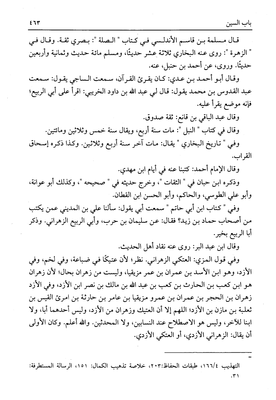 وفي قول المزي: العتكي الزهراني. نظر؛ لأن عتيكًا في ضباعة، وفي لخم، وفي الأزد، وهو ابن الأسد بن عمران بن عمر مزيقيا، وليست من زهران بحال؛ لأن زهران هو ابن كعب بن الحارث بن كعب بن عبد اللَّه بن مالك بن نصر ابن الأزد، وفي الأزد زهران بن الحجر بن عمران بن عمرو مزيقيا بن عامر بن حارثة بن امرئ القيس بن ثعلبة بن مازن بن الأزد؛ اللهم إلا أن العتيك وزهران من الأزد، وليس أحدهما أبا، ولا ابنا للآخر، وليس هو الاصطلاح عند النسابين، ولا المحدثين. واللَّه أعلم. وكان الأولى أن يقال: الزهراني الأزدي، أو العتكي الأزدي.
