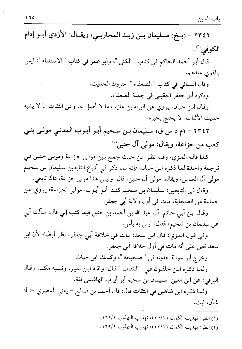 كذا قاله المزي، وفيه نظر من حيث جمع بين مولى خزاعة ومولى حنين في ترجمة واحدة لما ذكره ابن حبان، فإنه لما ذكر في أتباع التابعين سليمان بن سحيم مولى آل العباس، ويقال: مولى آل حنين. قال: وليس هذا مولى خزاعة، ذاك تابعي.