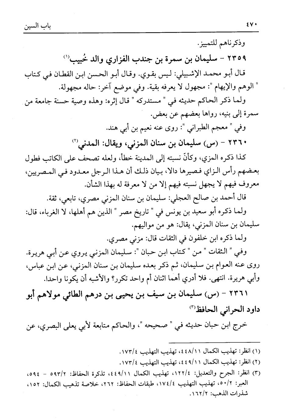 وفي "الثقات" من "كتاب ابن حبان": سليمان المزني يروي عن أبي هريرة. روى عنه العوام بن سليمان، ثم ذكر بعده سليمان بن سنان المزني، عن ابن عباس، وأبي هريرة. انتهى. فلا أدري أهما اثنان أم واحد تكرر؟ والأشبه أن يكونا واحدا.