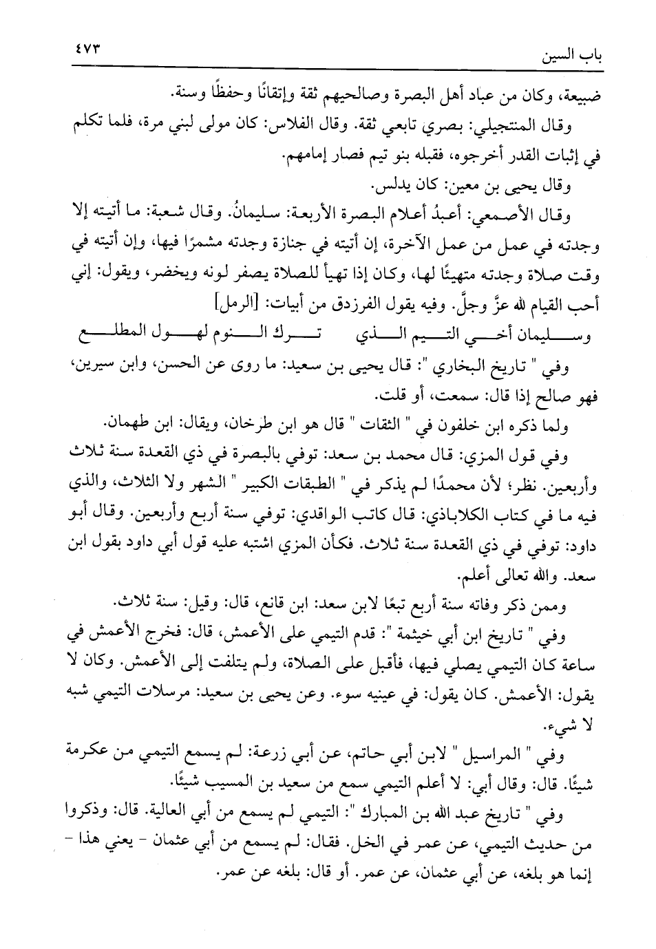 وقال الأصمعي: أعبدُ أعلام البصرة الأربعة: سليمانُ. وقال شعبة: ما أتيته إلا وجدته في عمل من عمل الآخرة، إن أتيته في جنازة وجدته مشمرًا فيها، وإن أتيته في وقت صلاة وجدته متهيئًا لها، وكان إذا تهيأ للصلاة يصفر لونه ويخضر، ويقول: إني أحب القيام للَّه عزَّ وجل. وفيه يقول الفرزدق من أبيات: [الرمل]