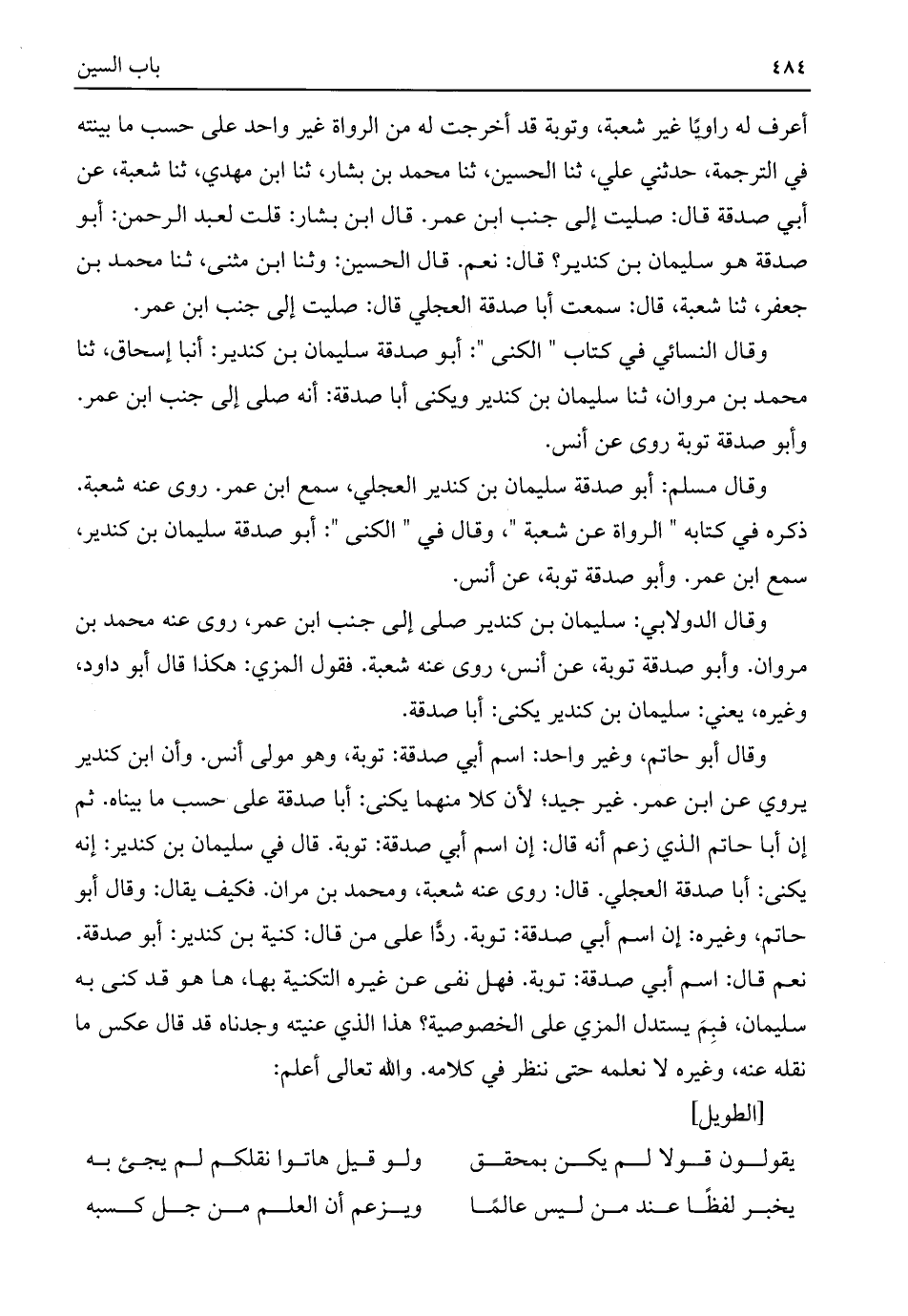 وقال أبو حاتم، وغير واحد: اسم أبي صدقة: توبة، وهو مولى أنس. وأن ابن كندير يروي عن ابن عمر. غير جيد؛ لأن كلا منهما يكنى: أبا صدقة على حسب ما بيناه. ثم إن أبا حاتم الذي زعم أنه قال: إن اسم أبي صدقة: توبة. قال في سليمان بن كندير: إنه يكنى: أبا صدقة العجلي. قال: روى عنه شعبة، ومحمد بن مران. فكيف يقال: وقال أبو حاتم، وغيره: إن اسم أبي صدقة: توبة. ردًّا على من قال: كنية بن كندير: أبو صدقة. نعم قال: اسم أبي صدقة: توبة. فهل نفى عن غيره التكنية بها، ها هو قد كنى به سليمان، فبِمَ يستدل المزي على الخصوصية؟ هذا الذي عنيته وجدناه قد قال عكس ما نقله عنه، وغيره لا نعلمه حتى ننظر في كلامه. واللَّه تعالى أعلم: [الطويل]