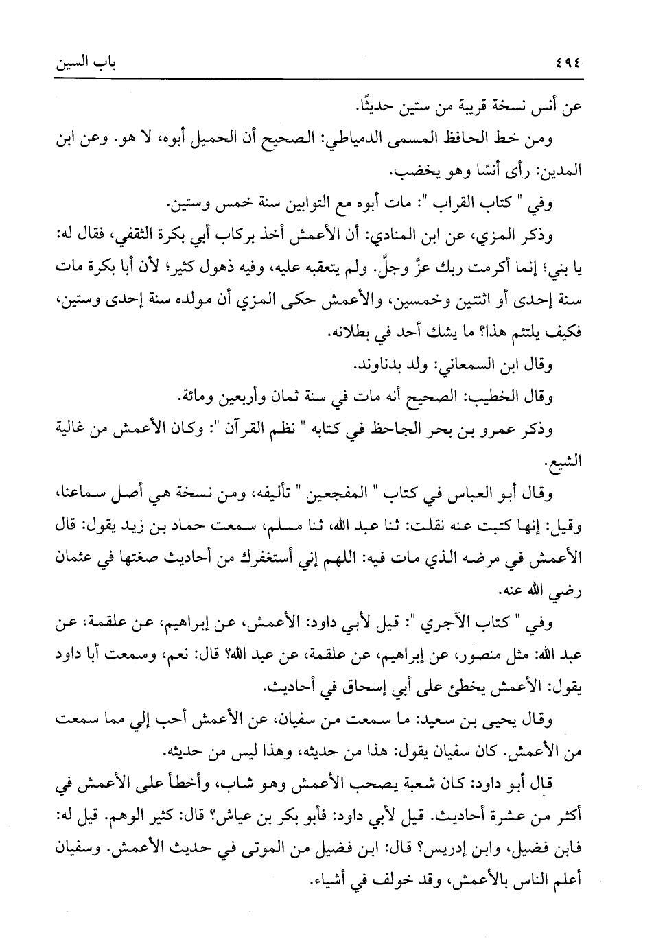 وذكر المزي، عن ابن المنادي: أن الأعمش أخذ بركاب أبي بكرة الثقفي، فقال له: يا بني؛ إنما أكرمت ربك عزَّ وجلَّ. ولم يتعقبه عليه، وفيه ذهول كثير؛ لأن أبا بكرة مات سنة إحدى أو اثنتين وخمسين، والأعمش حكى المزي أن مولده سنة إحدى وستين، فكيف يلتئم هذا؟ ما يشك أحد في بطلانه.