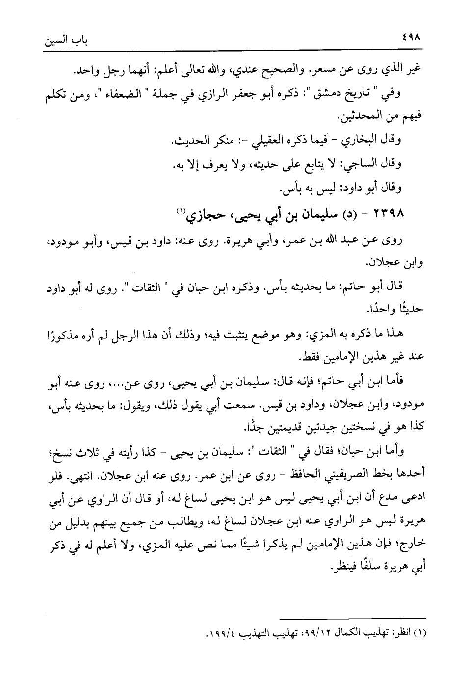 وأما ابن حبان؛ فقال في "الثقات": سليمان بن يحيى -كذا رأيته في ثلاث نسخ؛ أحدها بخط الصريفيني الحافظ- روى عن ابن عمر. روى عنه ابن عجلان. انتهى. فلو ادعى مدع أن ابن أبي يحيى ليس هو ابن يحيى لساغ له، أو قال أن الراوي عن أبي هريرة ليس هو الراوي عنه ابن عجلان لساغ له، ويطالب من جميع بينهم بدليل من خارج؛ فإن هذين الإمامين لم يذكرا شيئًا مما نص عليه المزي، ولا أعلم له في ذكر أبي هريرة سلفًا فينظر.